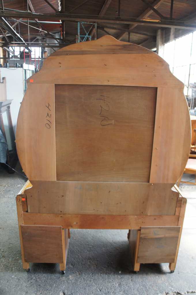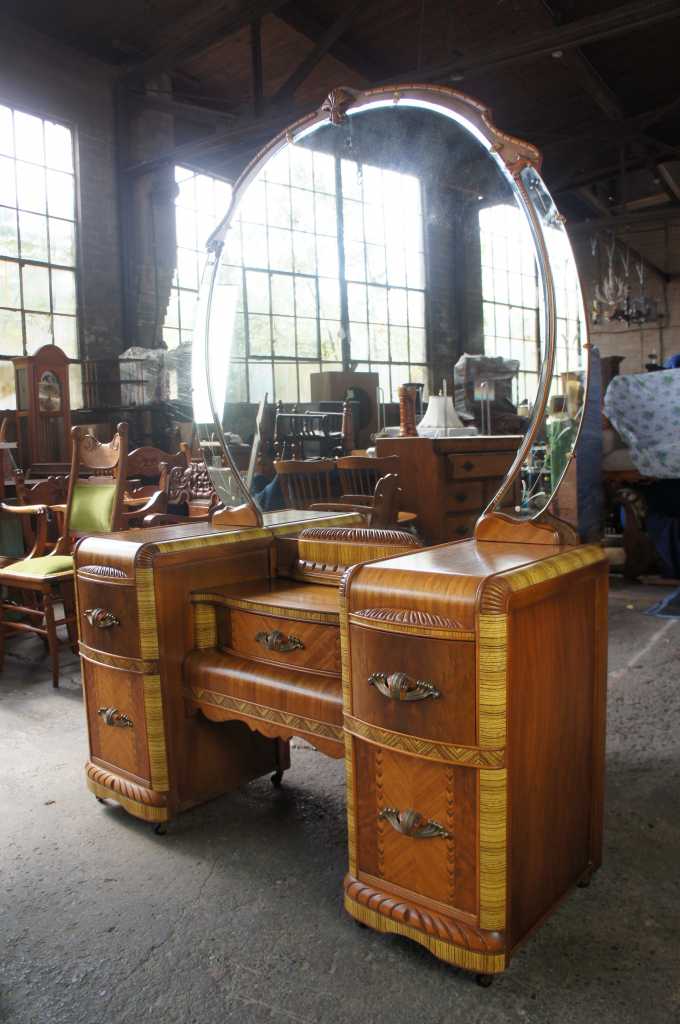 Gorgeous Art Deco era waterfall vanity and bench, circa 1920s. Part of a four piece set. Constructed from walnut with matchbook veneered front, burlwood and fruitwood inlays. Includes five dovetailed drawers with brass and Bakelite hardware. The massive round three piece mirror is both beveled and engraved with a floral design. Along the top is a fun pineapple carved finial. The perfect compliment to any setting