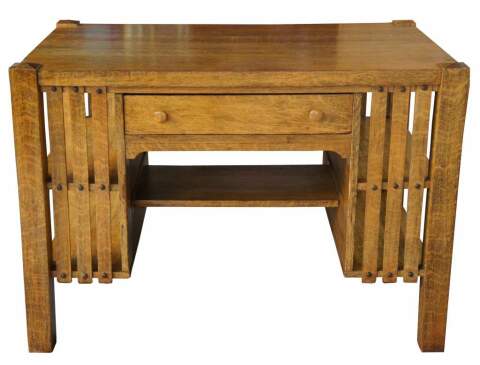A lovely 20th century quartersawn oak library table. Perfect for an office or library. Complete with two shelves on each side for books, a knee hole shelf and a central drawer for accessory storage. A nice compliment to any collection