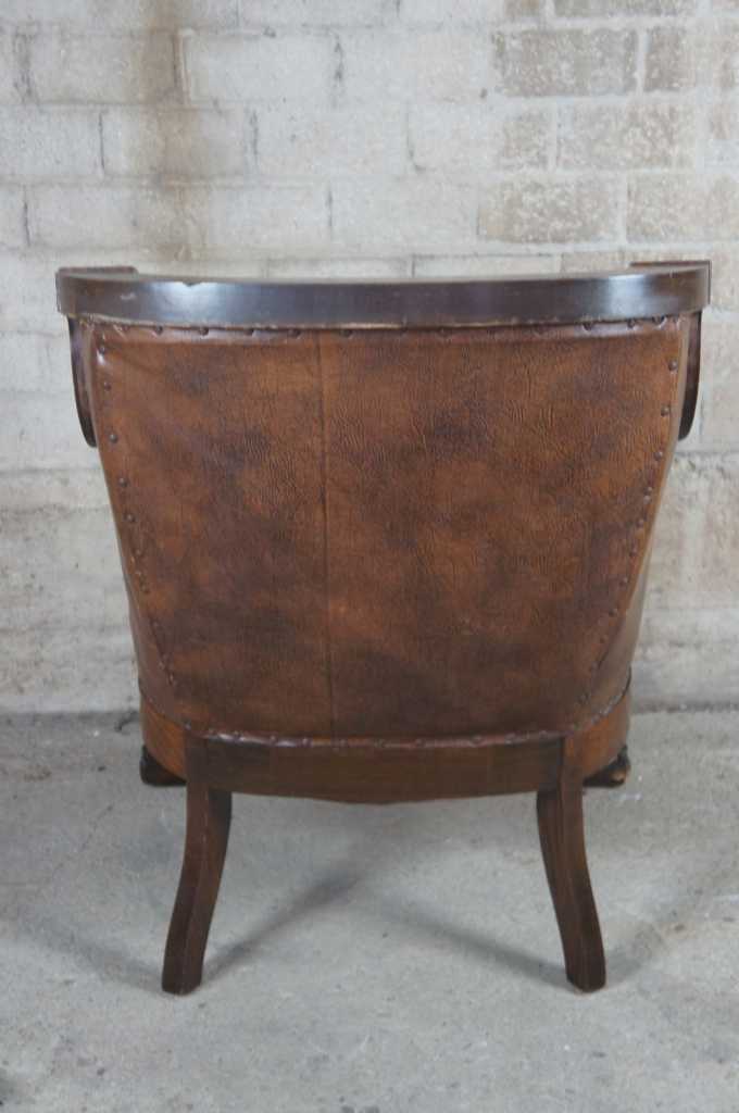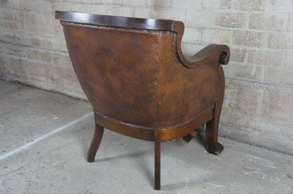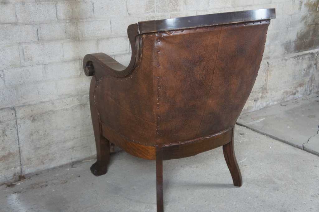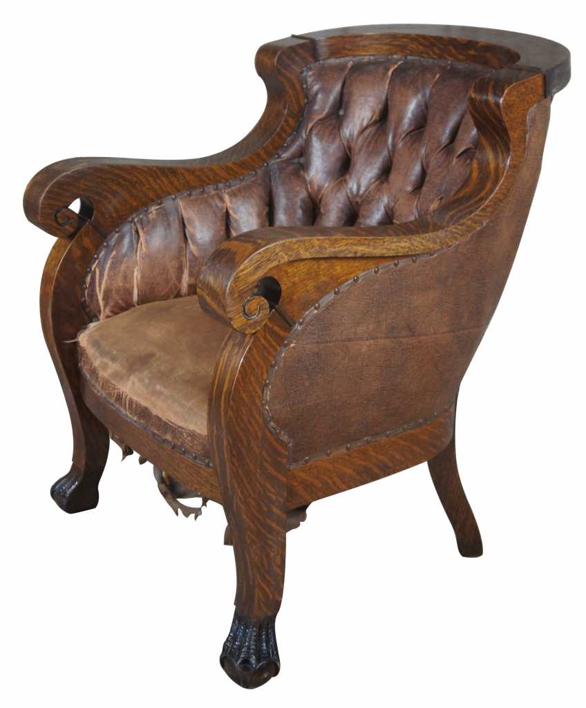 American Empire quatersawn oak arm chair with leather tufted back and ball and claw feet. Made from solid thick oak with scrolled arms.