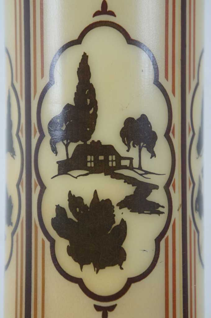 All-Lite skyscraper table lamp. Pink glass with country scene along the center.