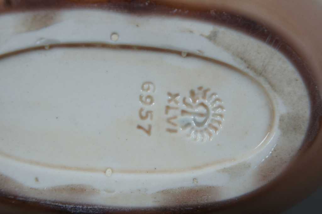 A 1946 Rookwood Pottery vase or planter with a taupe glaze and lambs in low relief to the front and back. Marked with pattern number 6957 to the base. Shape No. was used by rookwood between 1907-1967