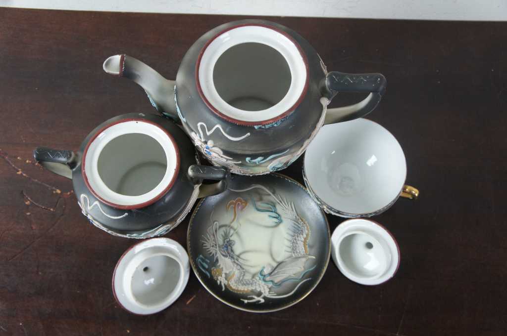 Antique Dragonware Tea Set; features hand painted high relief detail. The cup has a lithophane relief face in the bottom.