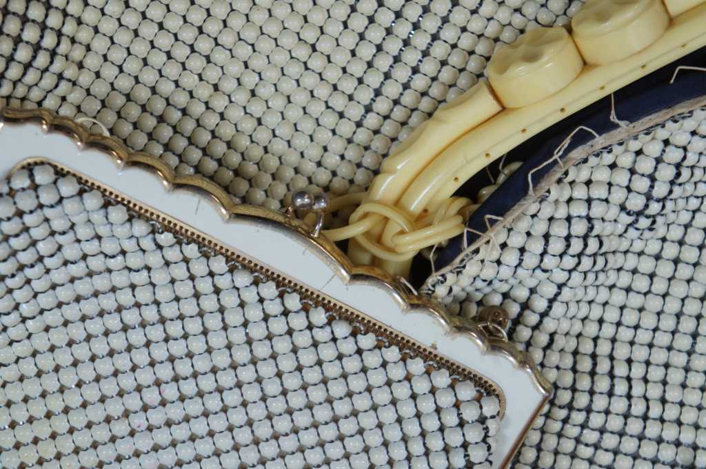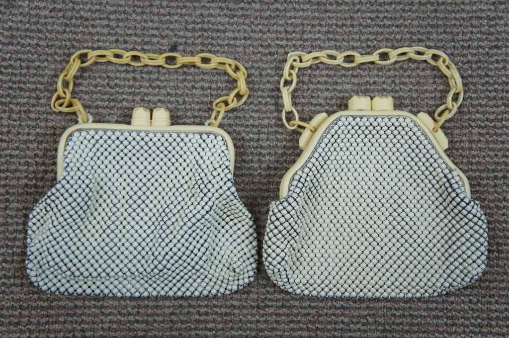 Very Good – Largest purse clasp stuck shut/separating from bag; second largest has metal clasp instead of bakelite; smallest purse chain detached from clasp; gentle wear throughout; see pictures