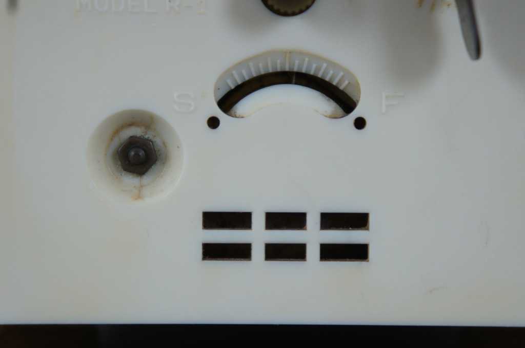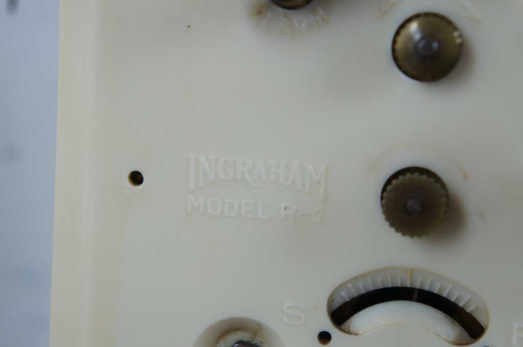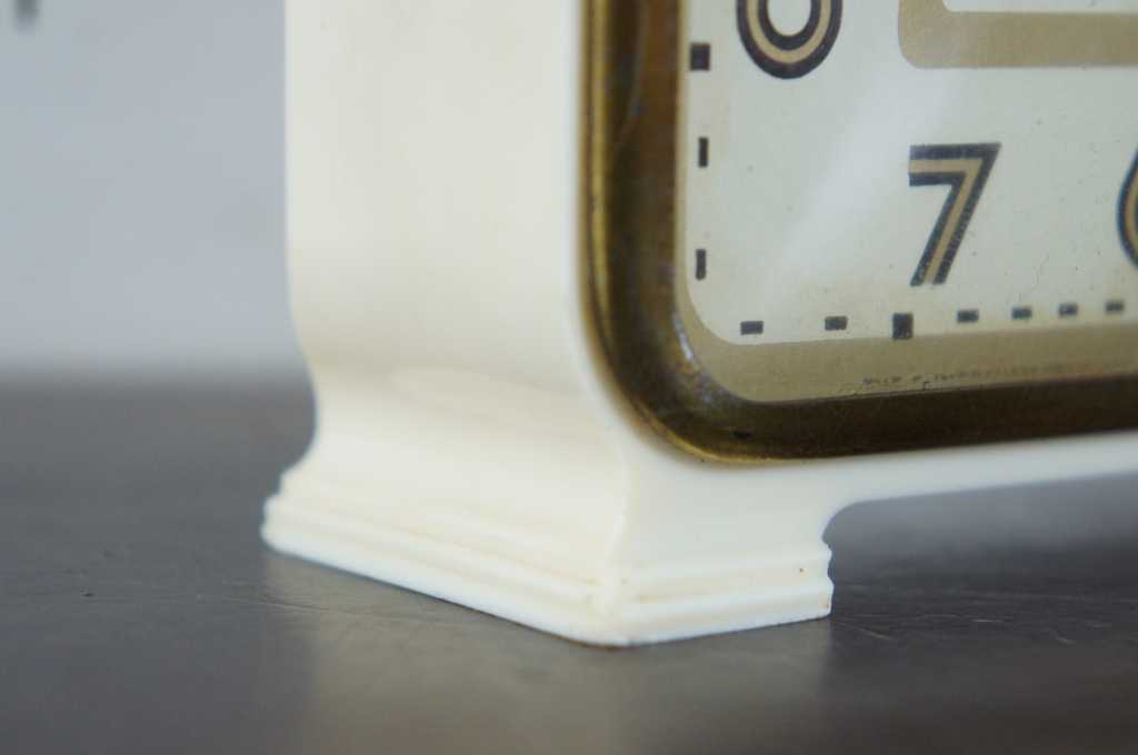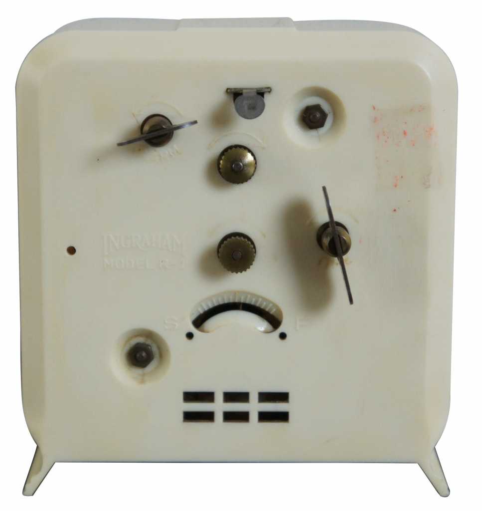 Ingraham Model R-1 Time Square Wind Up Alarm Clock. A white Bakelite case rest upon splayed legs with bronze colored trim