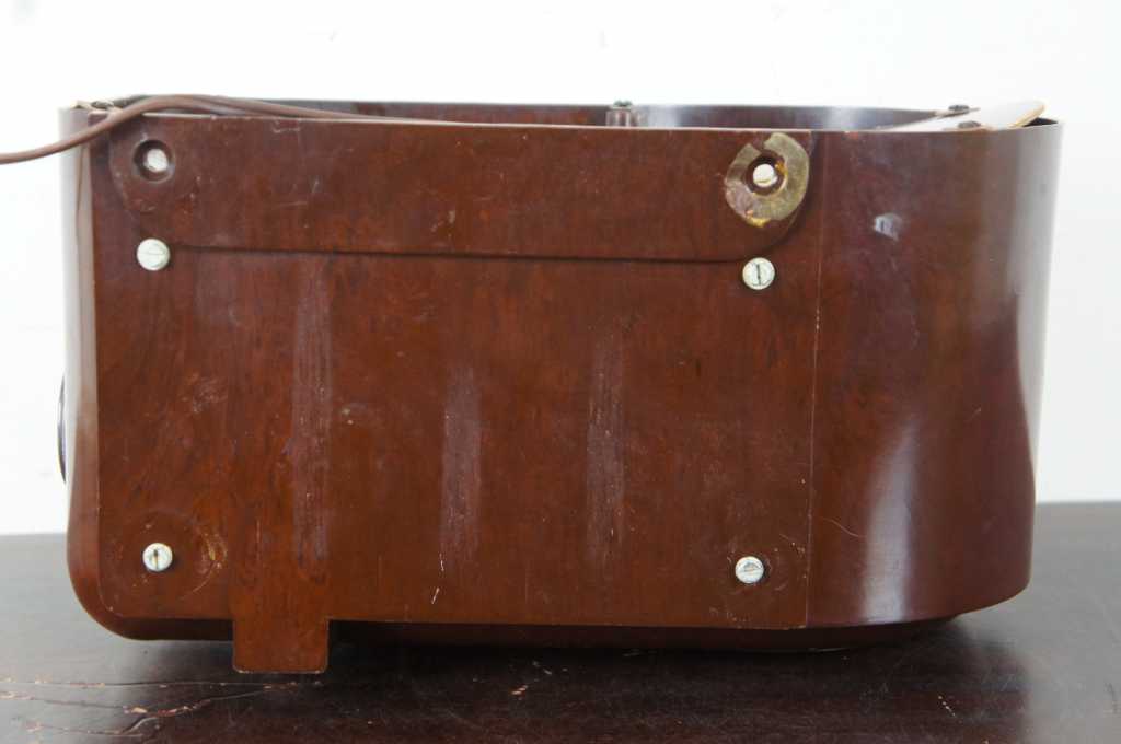 The Stewart Warner "Varsity" is a beautiful blend of deco and machine age styling that was marketed towards college students and were often sold with two-tone painted cabinets carrying the school colors. Stewart Warner also had available the standard brown bakelite, plaskon or ivory-painted bakelite cabinets. This particular model is most likely a later version released a year or two after the original Varsity series was introduced. The original "Varsity" series including the model 97-562 used a 4-tube superheterodyne with regeneration around the I.F. stage, and this particular model 07-5B1 (chassis model 07-5B) has the standard AA5 5-tube superheterodyne receiver circuit.