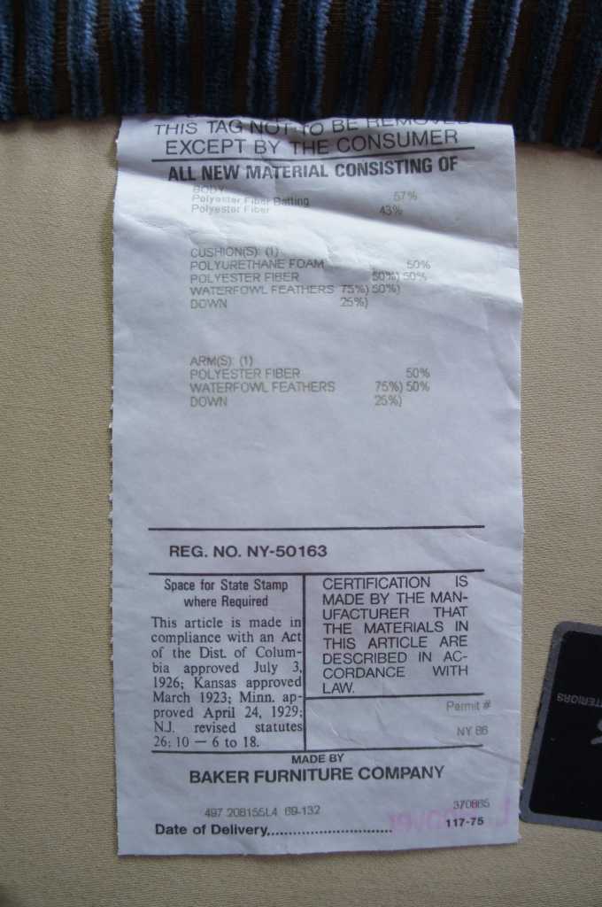 Made from mahogany with brass mounts and a blue striped corduroy upholstery.