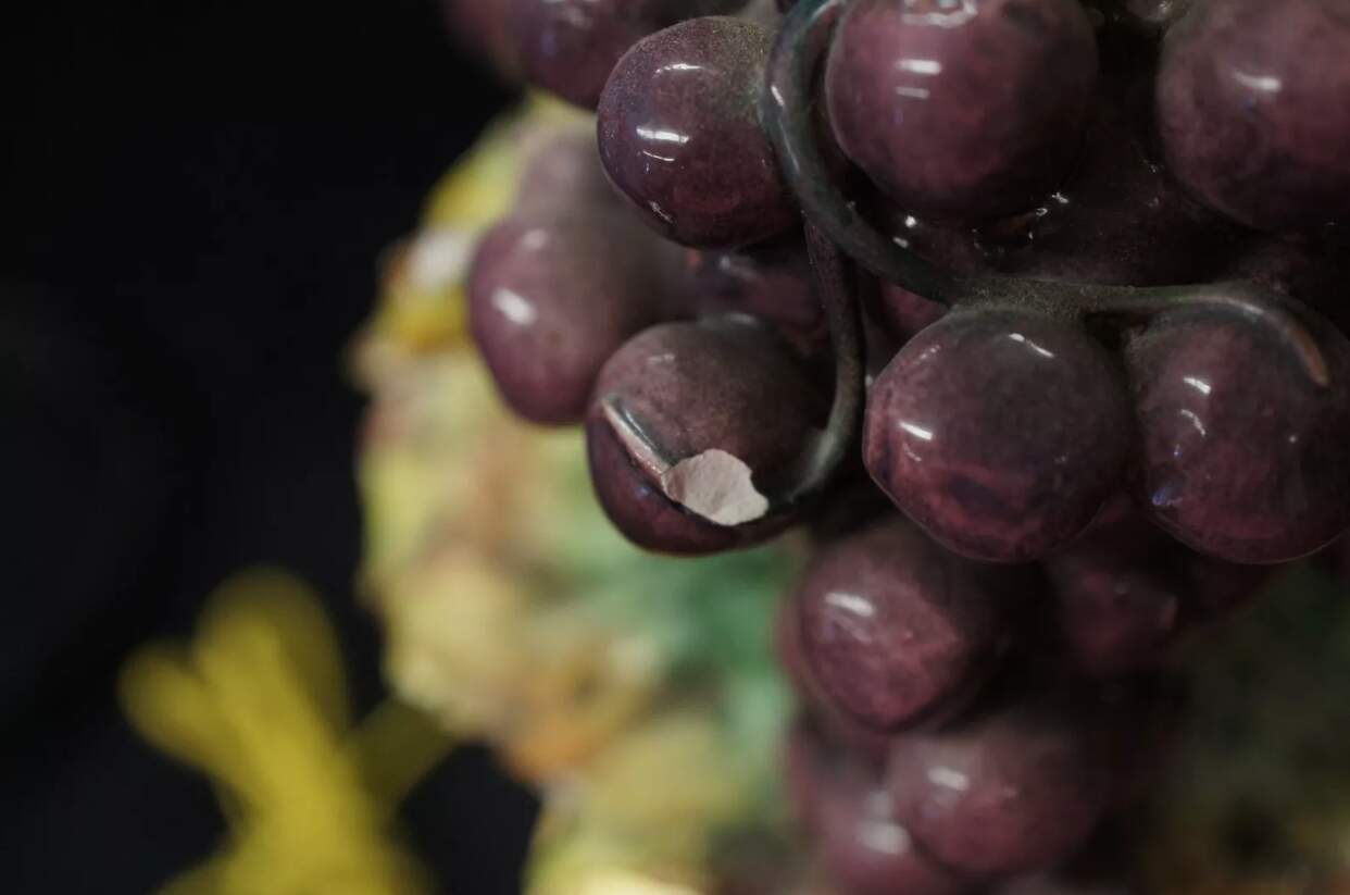 Maker unknown and features a hand painted green and purple grape design