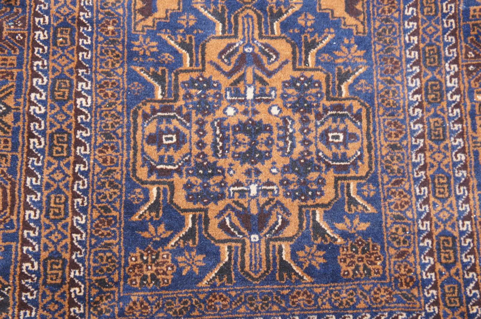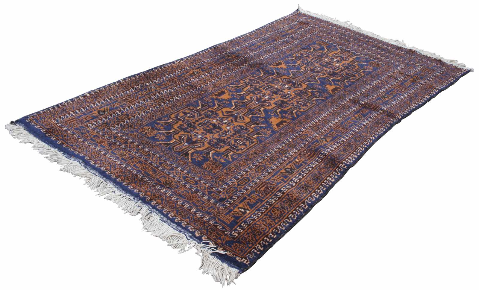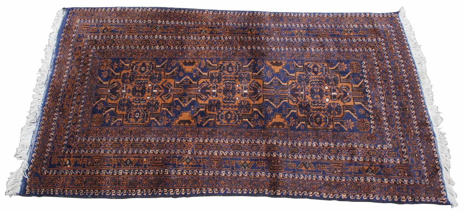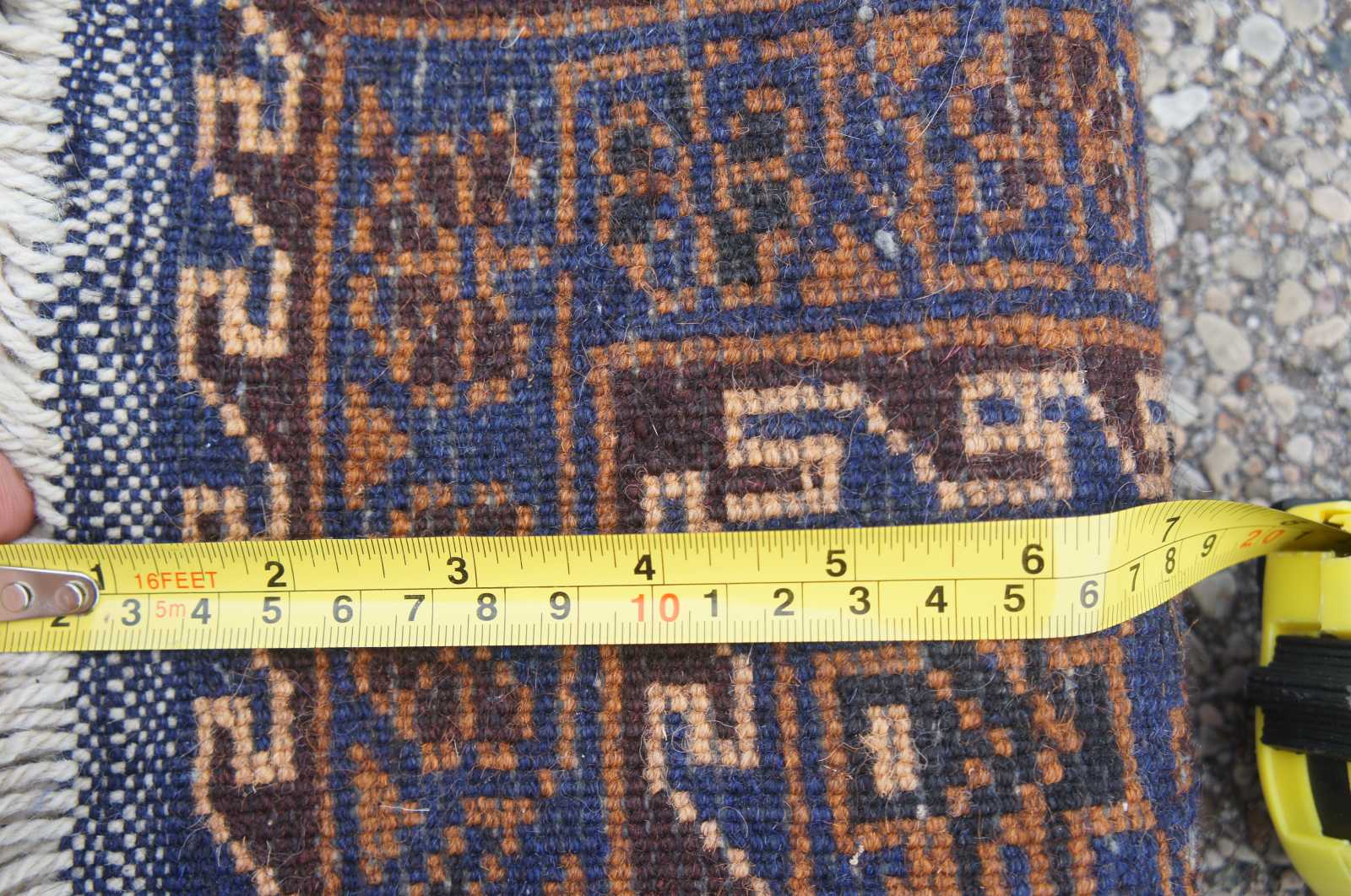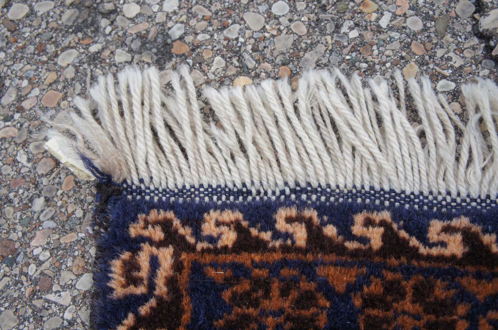 Vintage Persian Baluch wool area rug. Features a geometric repeating pattern with a field of navy blue accented with orange / brown, and tans. Baluchi rug, Baluchi also spelled Baloochi or Balochi, floor covering woven by the Baloch people living in Afghanistan and eastern Iran. The patterns in these rugs are highly varied, many consisting of repeated motifs, diagonally arranged across the field and a maze of intricate latch-hooked forms.