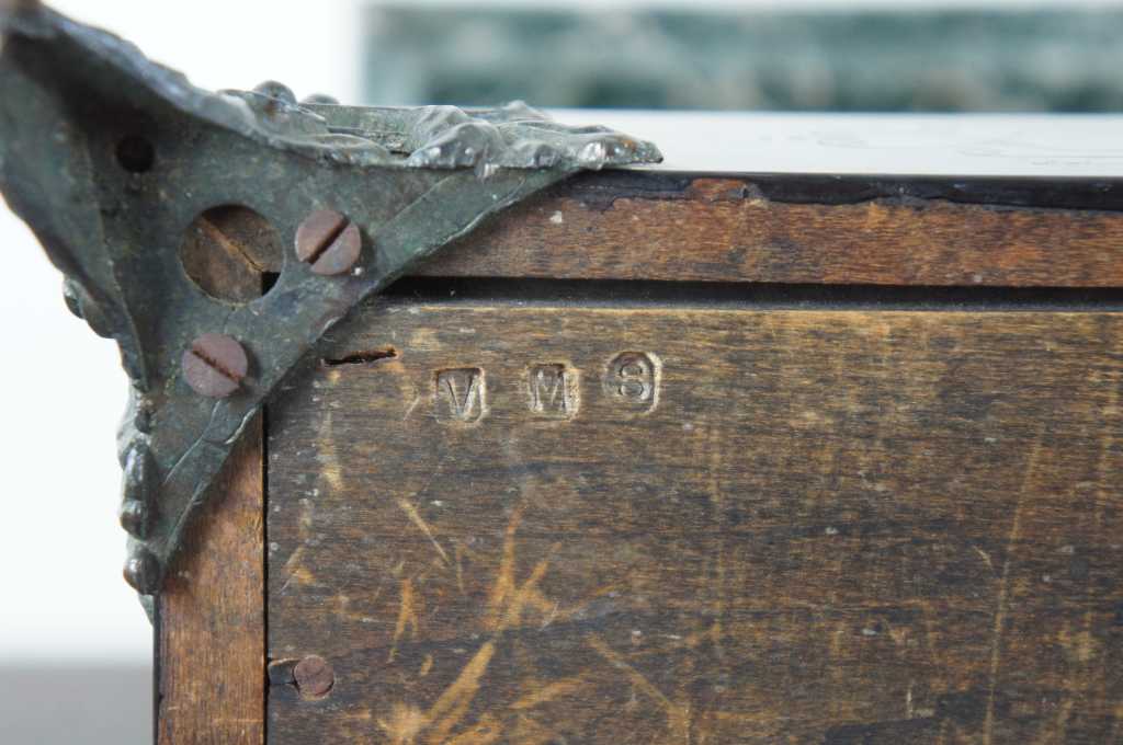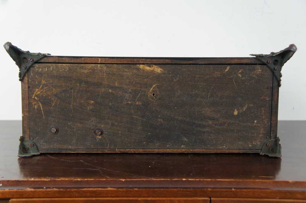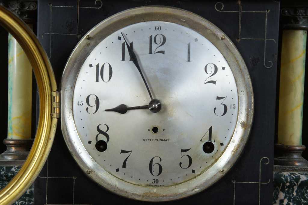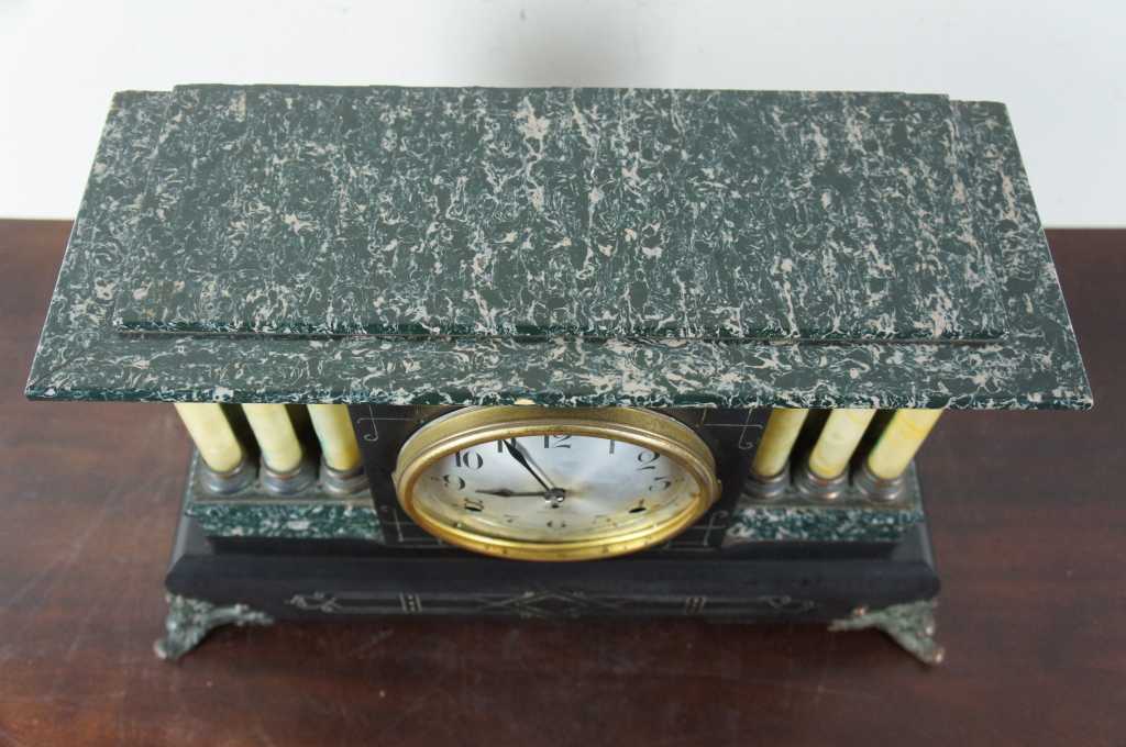 Seth Thomas Adamantine Servia Imperial Mantel 8 Day Clock, Circa 1905. Features a faux green marbled front with celluloid columns and copper plated feet.