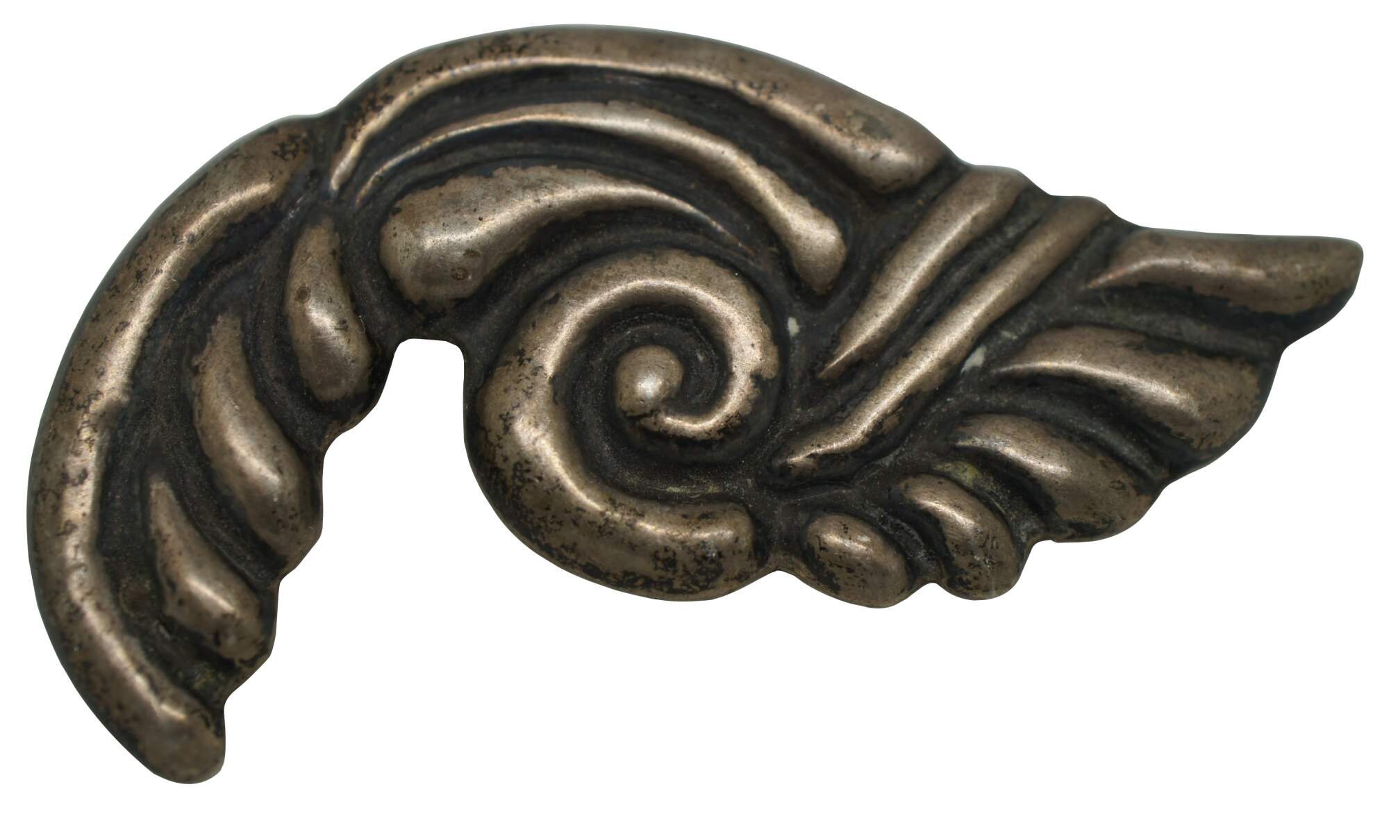 Three piece vintage Mexican sterling silver jewelry set including a segmented bangle bracelet with inset geometric Aztec patterns, a brooch featuring a swirling traditional folk art design resembling a wing, and a pair of rounded geometric screw back earrings with the shape of a ying yang. Marked sterling silver 925, Taxco, Mexico, AMD