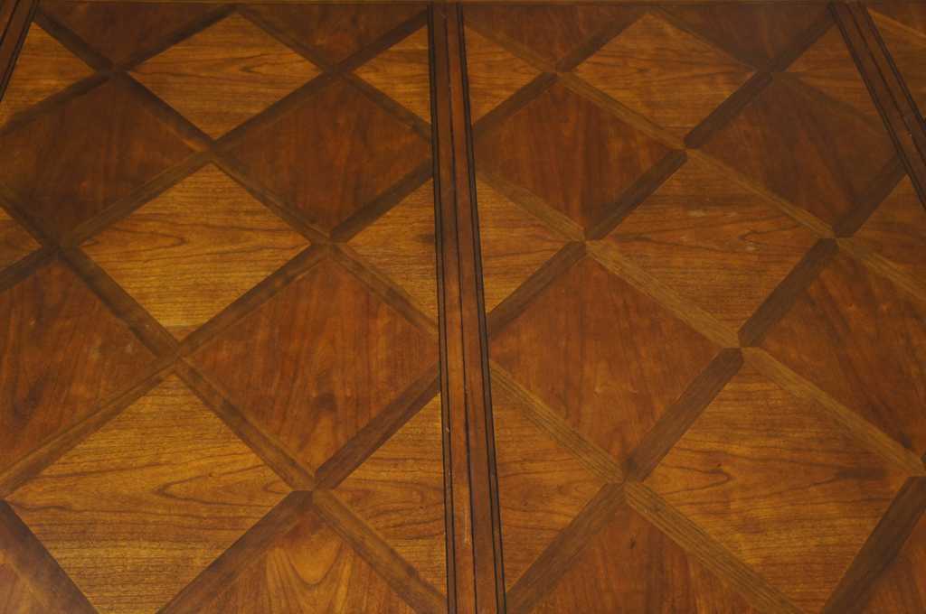 Early 2000's Ethan Allen Tuscany Collection dining room table. A beautiful walnut finish with parquetry diamond pattern design over double pedestal base. Each base shows four legs with acanthus carving along the top. Table extends from 6'6" to 10'6". Matching dining chairs available.