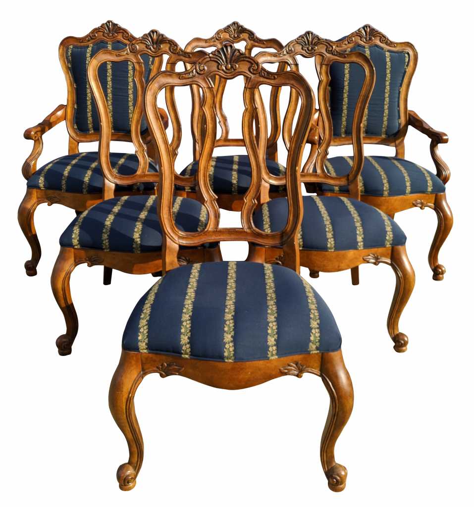 A set of eight “Tuscany Augustine” arm chairs by Ethan Allen. These Italian inspired dining chairs have serpentine backs with a carved crest, gently curved arms, serpentine aprons, and cabriole legs with scrolled feet to the front. The chairs have a beautiful blue upholstery with gold and green stripes of flowers.