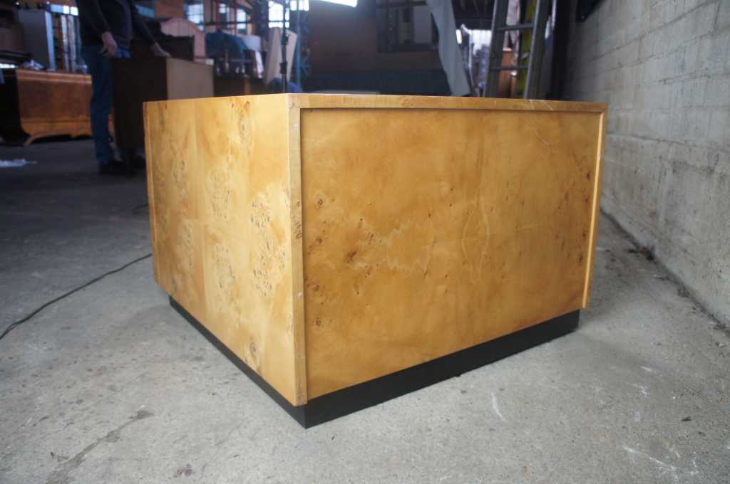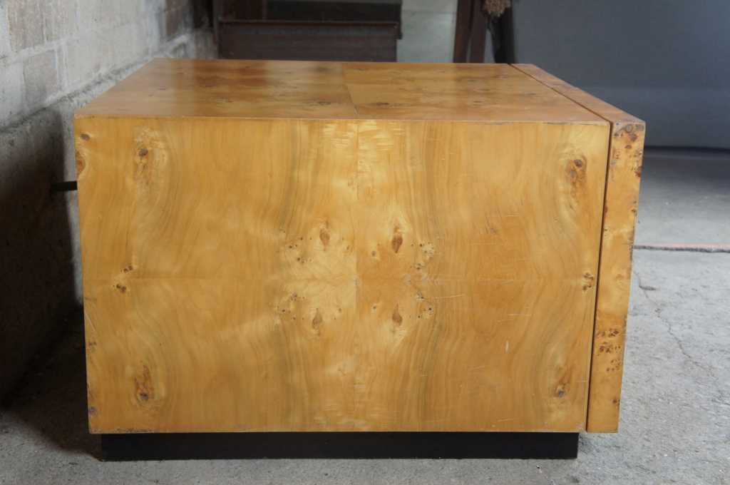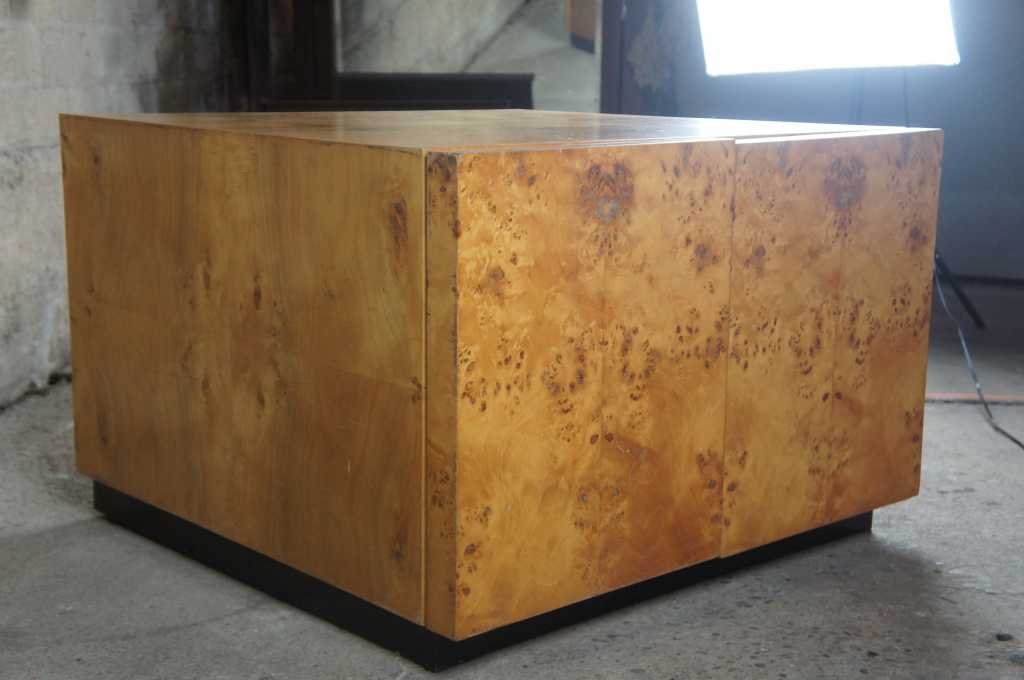 Vintage 1976 Arthur Umanoff for Dillingham Manufacturing Company two door commode or cabinet. Features olive burl wood over black pedestal base; a minimalist square or cube design. Stamped 2757 on base. Great for use in corner or as accent table.