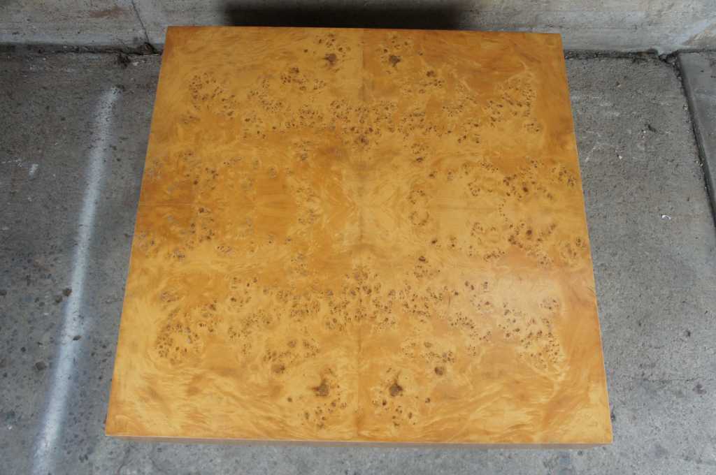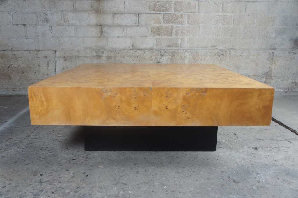 Vintage 1976 Milo Baughman cocktail table; features and olive wood book match veneer top; a minimalist square or cube design with a black pedestal base. Stamped 2754 on base.