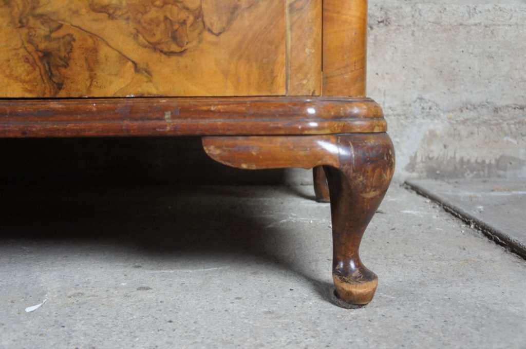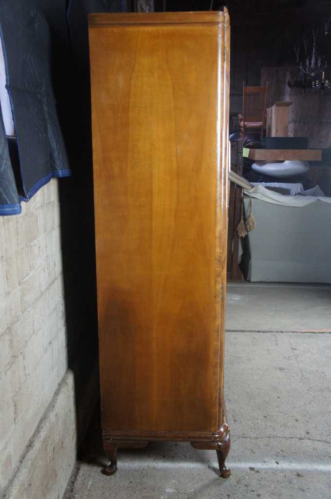 Early 20th Century French art deco armoire; made from oak with book match veneer front and waterfall sides; interior opens to a closet for hanging along one side and drawers and shelves along the other; this unit knocks down into three pieces for ease of movement.
