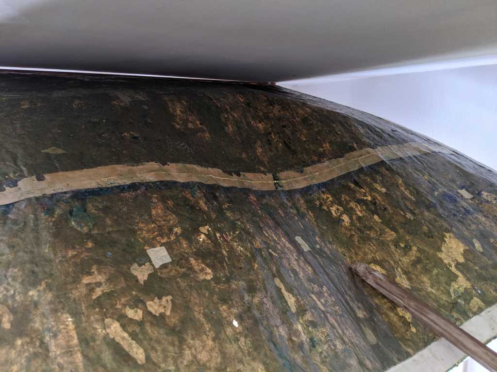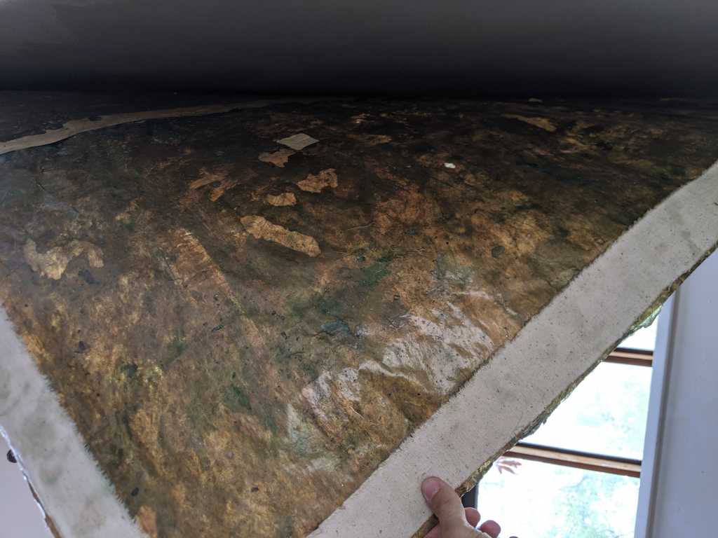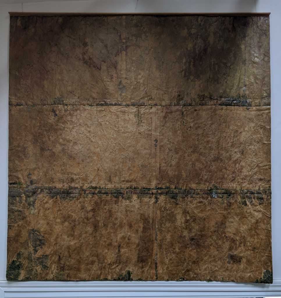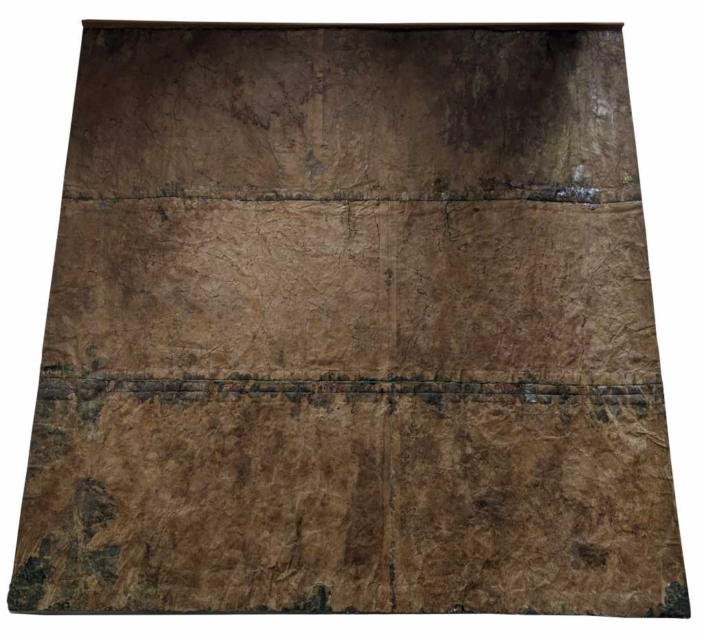 Leather tapestry artwork by Paolo Pelosini. Untiled. Paolo began his journey as a painter. He graduated from the Instituto D'Arte of Lucca in 1964 and from the Accademia D'arte of Florence in 1969. That year he moved to the U S and enroled in the M F A program at the University of Minnesota. In 1970 he switched to painting Conceptual Art. After teaching for two years at the Cleveland Institute Of Art he moves to New York in 1975. In 1982 begins sculpting, cutting found metal objects with an ax. Today he still uses the same method and materials, in his studios of Spanish Harlem and Massarosa.