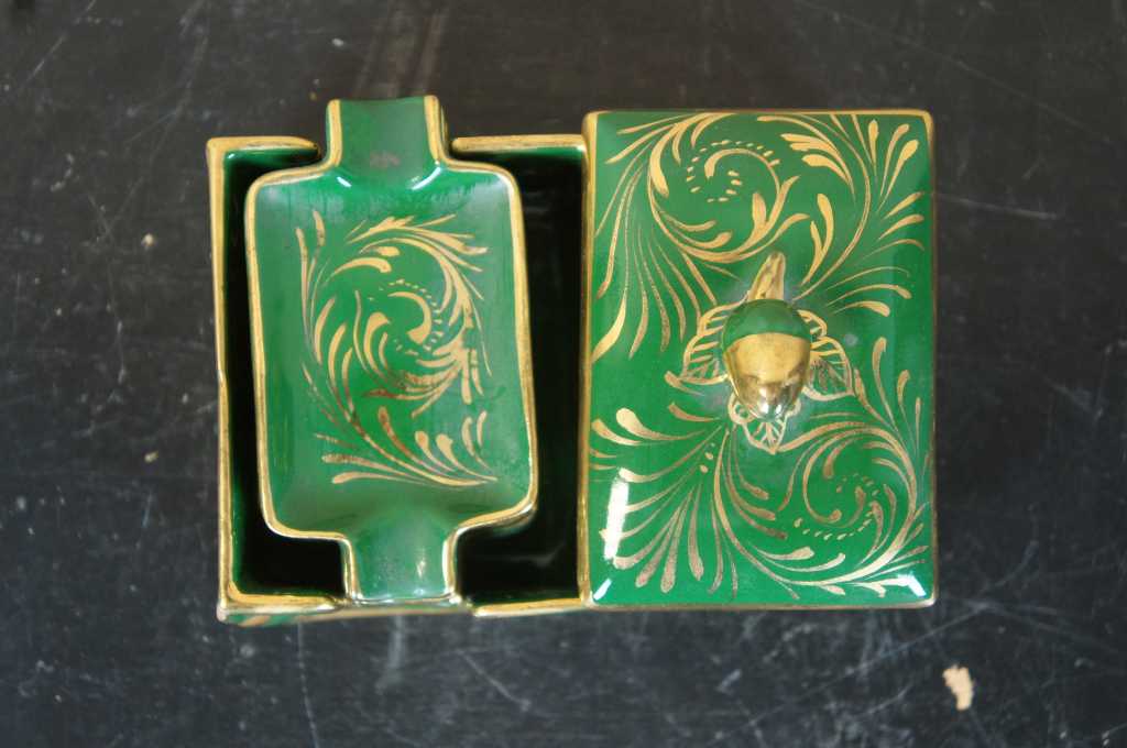 Mica hand painted porcelain cigarette box and ashtray set; features green base with gold accents