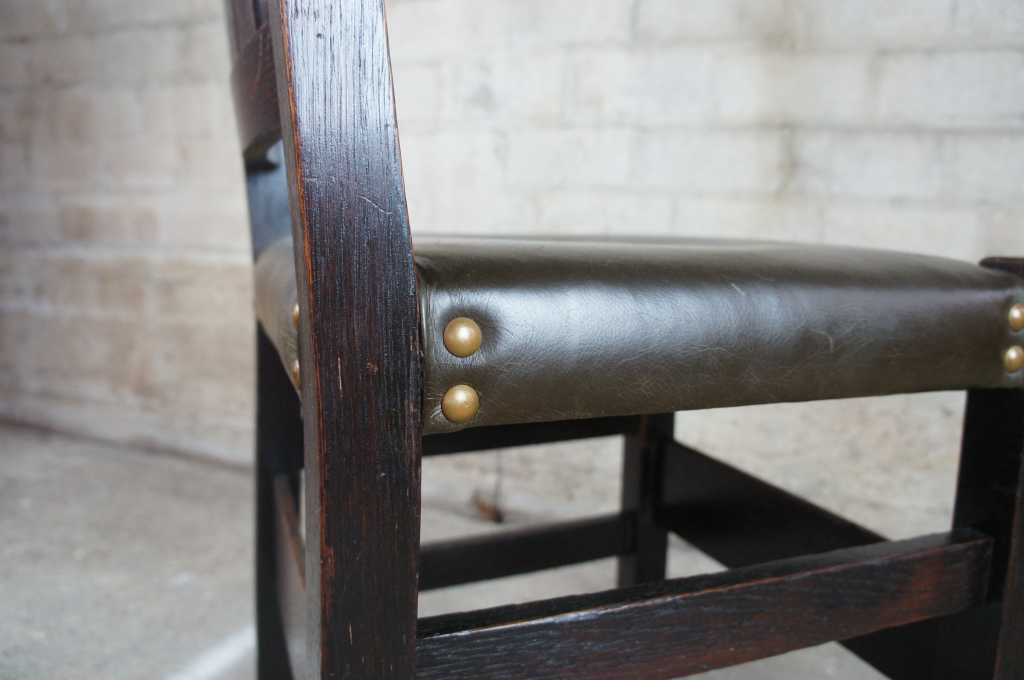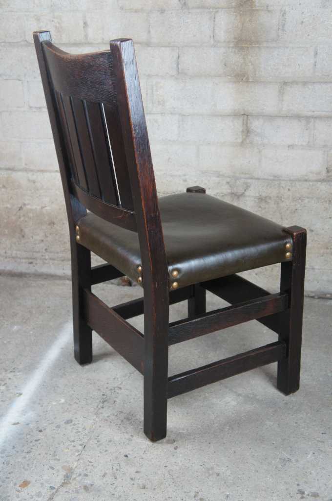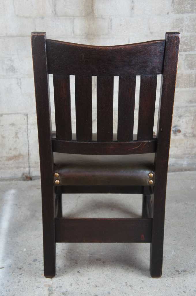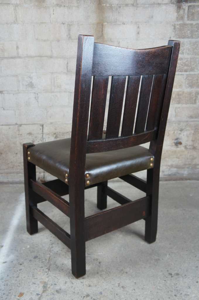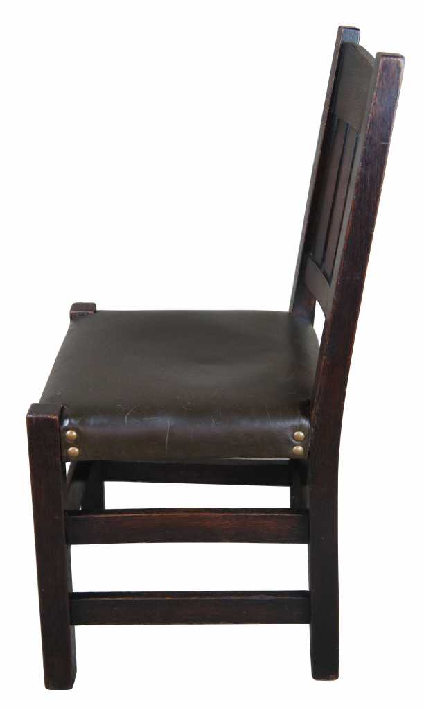 A beautiful Gustav Stickley side chair with leather seat and brass nailhead trim. Marked along the back, 1904-1907.