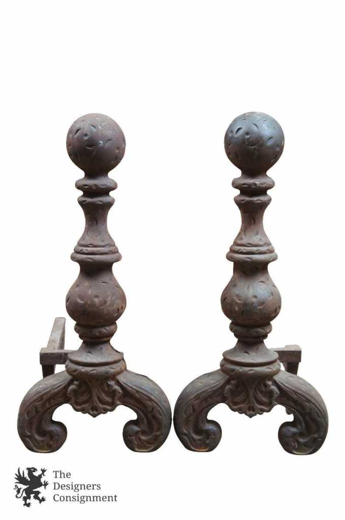 Early 20th Century Antique Cast Iron Andirons Chenet Fireplace Pair Rustic