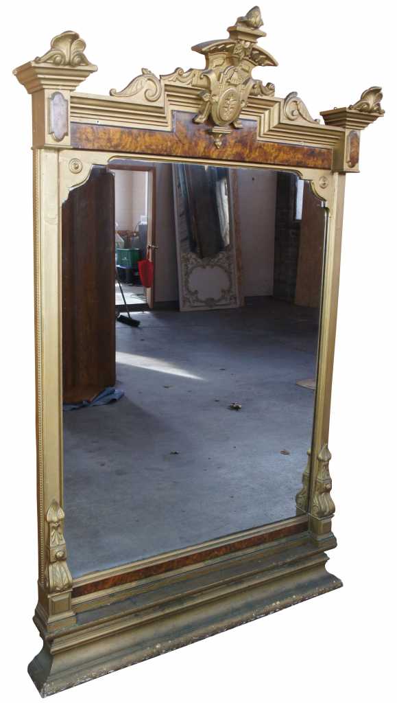 Circa 1870s Renaissance Revival mantel mirror. Features ornate giltwood design with walnut burl paneling and acorn finial crown. Outfitted with base, allowing it to be used as a pier mirror as well.