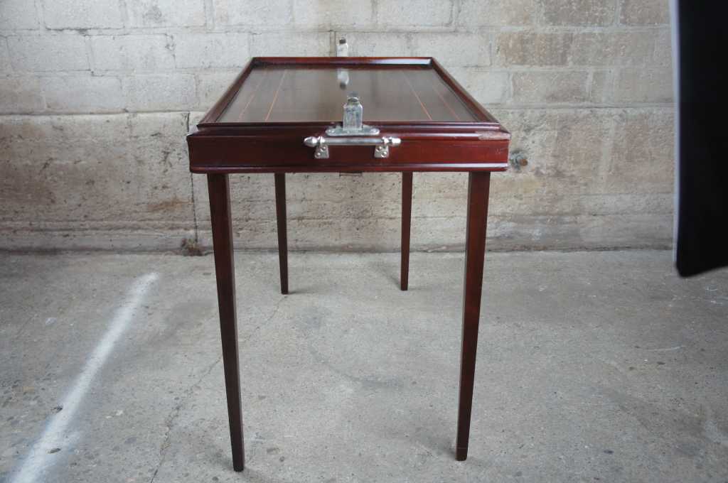 A Mid Century mahogany folding tray table, attributed to Scheibe. A neat inset design with banded inlay, handles and push buttons that neatly fold or release the legs.