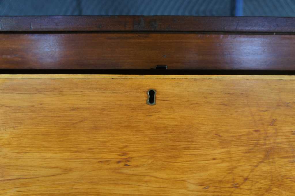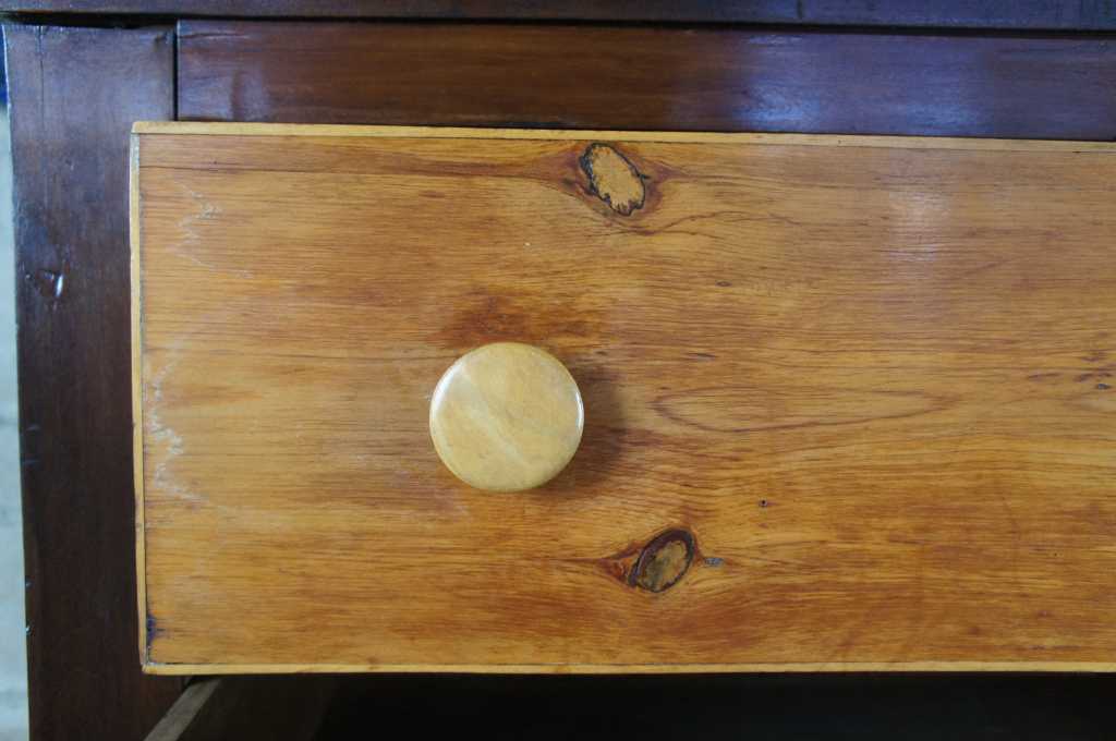 Imperfections are the result of aging; distressing and markings to top, split in back panel, old notch above top drawer from being pryed open