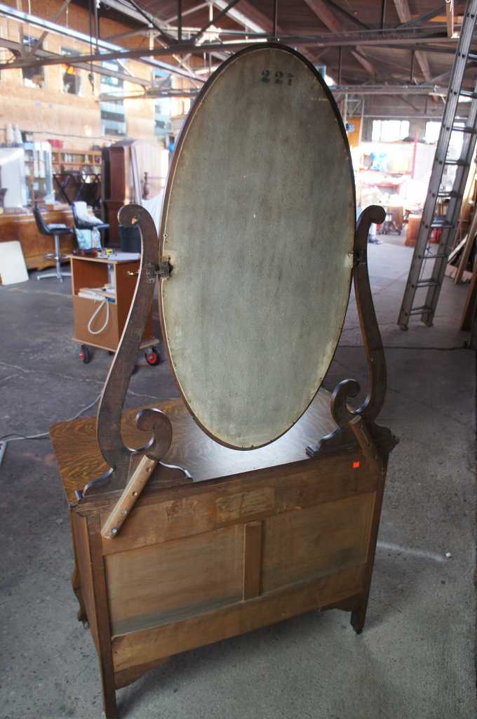 Quartersawn oak dresser and mirror. Circa 1890s, serpentine four drawer front and rear tilting mirror. Mirror is held by scrolled supoprts. Dresser features dovetaled drawers and wheels for easy movement. History and Bio: L. C. & W. L. CRON & CO., dealers and manufacturers of furniture, Piqua. There are probably but few of the successful merchants and manufacturers of the city of Piqua who are equal in energy, enterprise and a clear conception of the wants of the public to the firm of L. C. & W. L. Cron & Co., manufacturers of all kinds of plain and fancy house furniture, and also of all classes of office furniture, desks, cases. etc. this firm has also one of the largest business rooms in the city of Piqua. located at No. 144 Main street, where they have as fine a stock of furniture as any house in this part of the State. L. C. & W. L. Cron & Co. are amply prepared to furnish anything in the undertaking line; they drive a hearse second to none in the city. In 1868, the above business was opened by L. C. Cron. which he managed and carried on until 1869, when he took in his present partners, and the firm's name since has been unchanged this firm have, for the past eleven years, run their factory to almost its full capacity, and now feel the need of a more commodious. convenient and substantial structure, which is now being erected; it will. no doubt, be one of the best of its kind in the State; its completion is anticipated during 1880; this factory, though not located in the corporation limits of the city of Piqua, possesses all the advantages of those in the corporation, such as hydraulic conveniences, gas, etc. The gentlemen of this firm are of the most substantial and reliable men in the place. L. C. Cron, the senior member of the above firm, was born in Piqua Sept. 16, 1836, and was a pupil of the city schools, where he received a good business education; early in life he commenced working under instructions at his present trade, which he has since put to good use, and is now the master wheel of the furniture department of Piqua. In 1861, he entered the United States Army, where he spent three years; while in the service he participated in the battles of Cedar Creek, Ft. Petersburg, and many others of less renown, passing through various hardships as a soldier. Since his return to Piqua, he has filled the most important offices of the corporation in which he lives, and is at present Justice of the Peace. The marriage of L. C. Cron and Margaret Ginn was celebrated Sept. 29, 1859; their children were five in number, viz., George L., born Aug. 27, 1864; died Feb. 15, 1867: Maggie E., born March 12, 1866; Charles L., born Sept. 26, 1867; Jackson C., born June 18, 1869; Albert M., born Dec. 27, 1871; died July 25, 1878. Mrs. L. C. Cron was born in Miami Co., Ohio, Sept. 7, 1838, and died Dec. 27, 1873. L. C. Cron married, for his second wife, Marcella Edmonds of Dayton, Ohio; their marriage was celebrated. Aug. 11, 1874; she was born Dec. 4, 1847; they, by this union, had two children, viz., Hattie B., born July 27, 1875, and Minnie A., born Sept. 19, 1878; died July 1, 1879.
