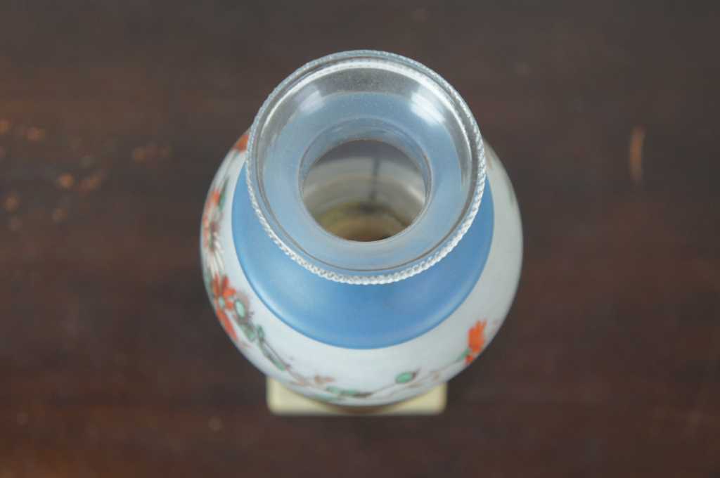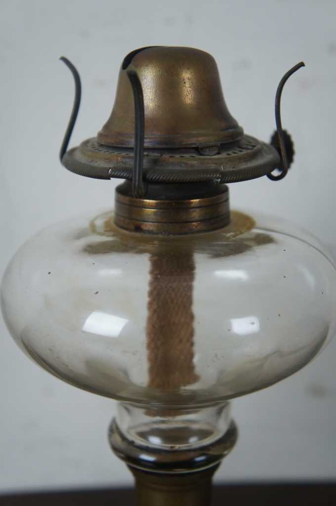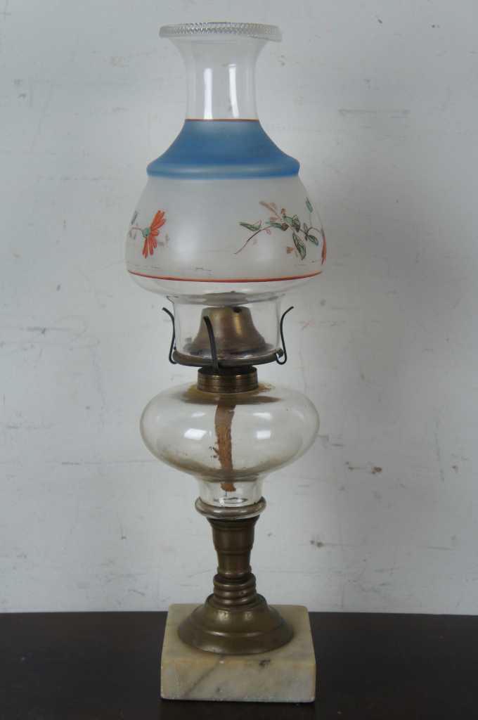 M. B. Co., NY Kerosene Lantern. Features a marble base and brass support leading to glass. Shade is hand painted with floral design. Circa 1900s.