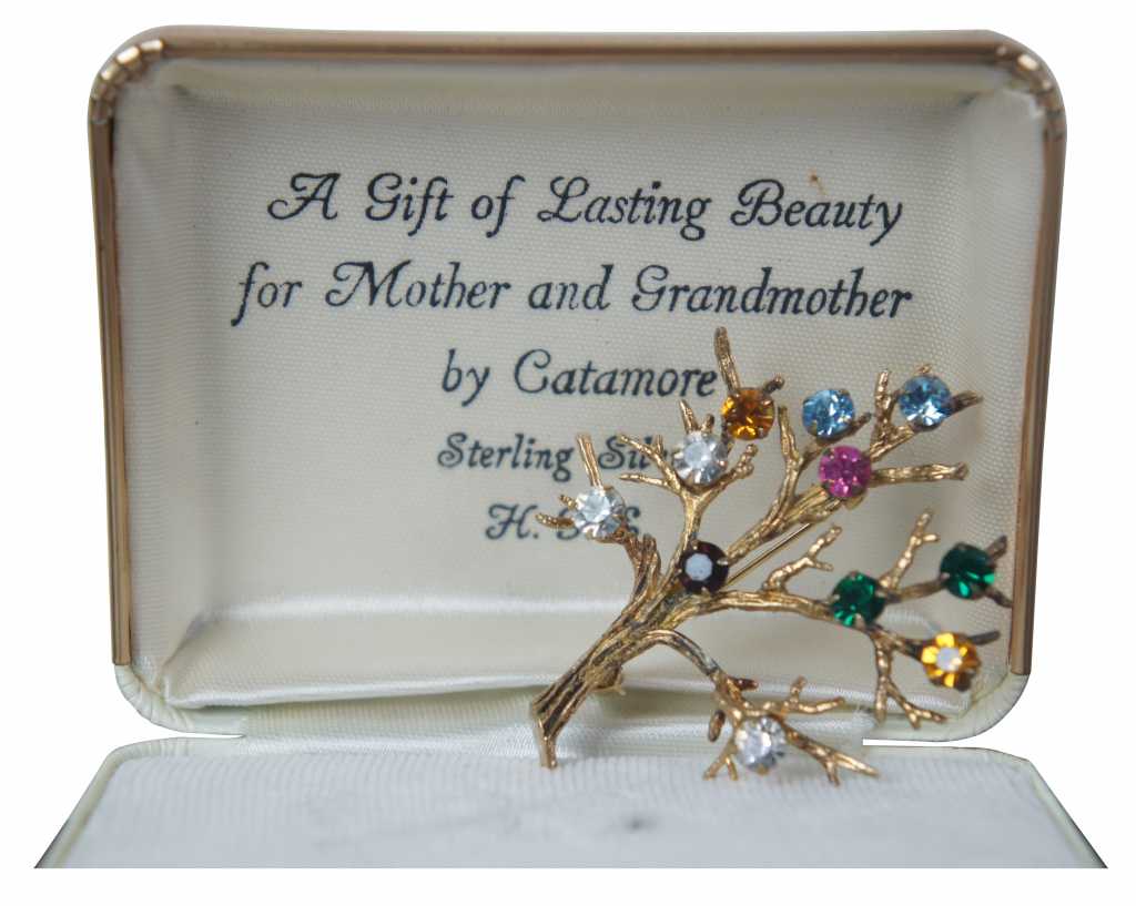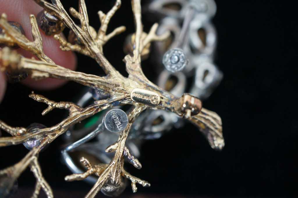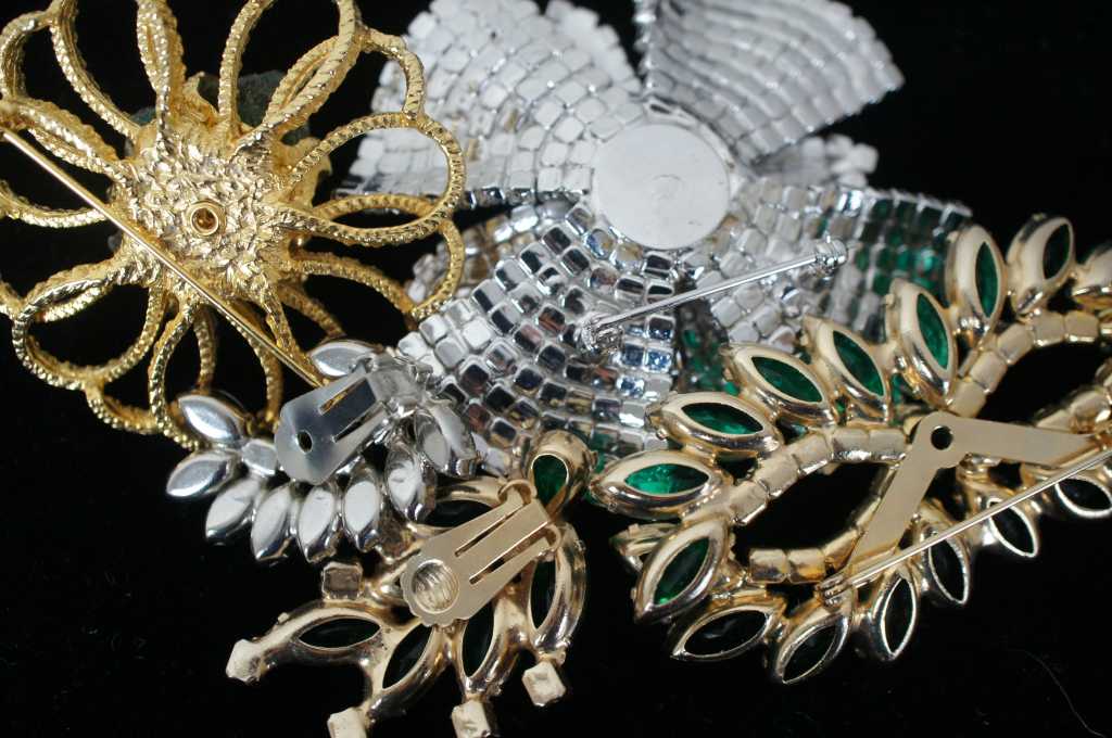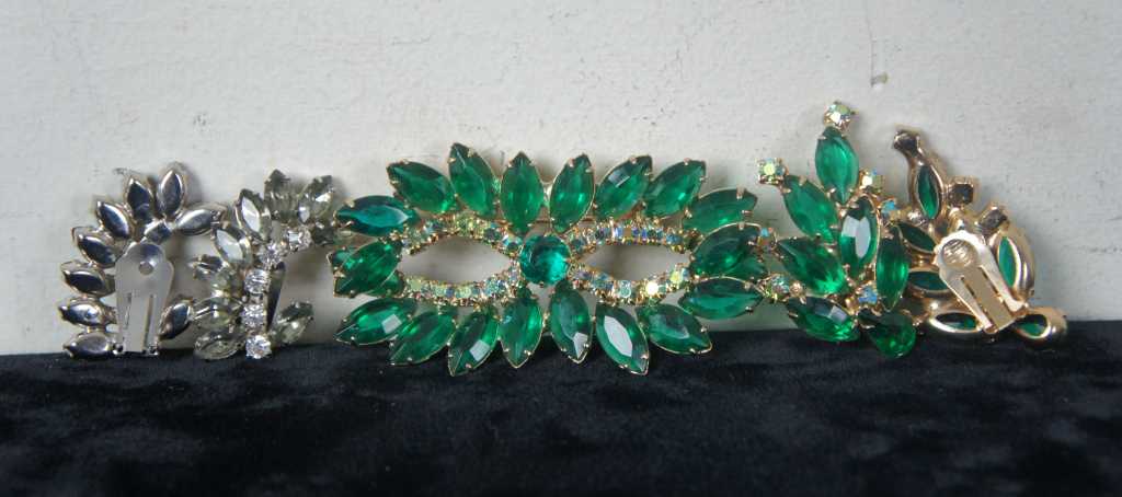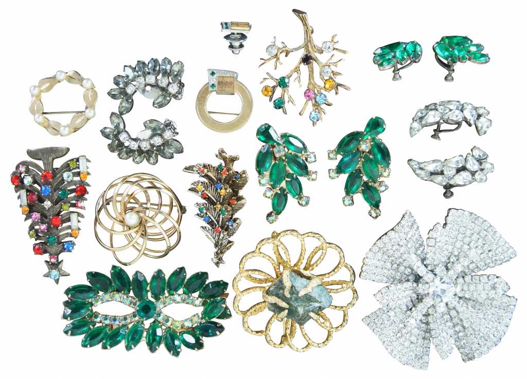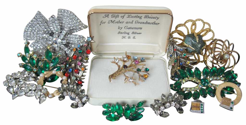 Largest - 3” / Smallest – 0.5” x 0.5” / Sterling Tree Pin – 9.4g / Sterling Rhinestone Earring – 6g / Sterling Small Green Rhinestone Earring – 3.8g (Diameter/Length x Width/Weight)