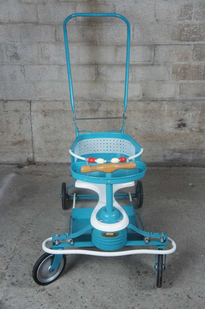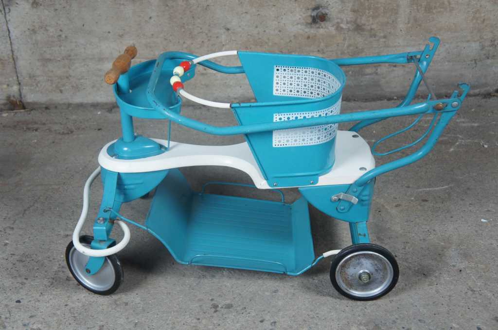 A beautiful machine age baby stroller. Turquoise with white accents.