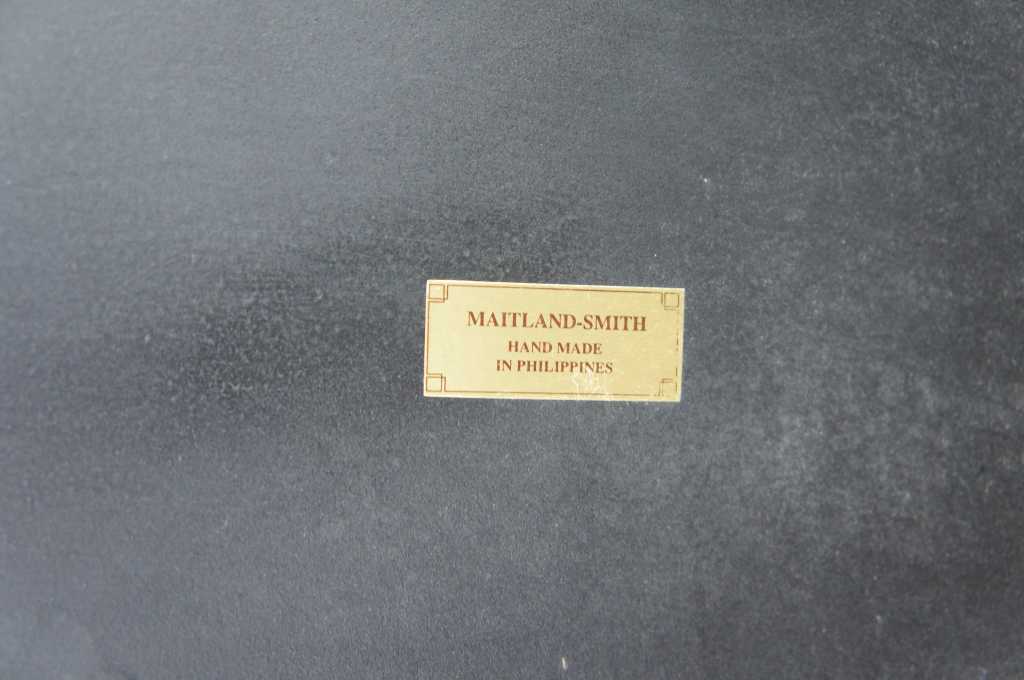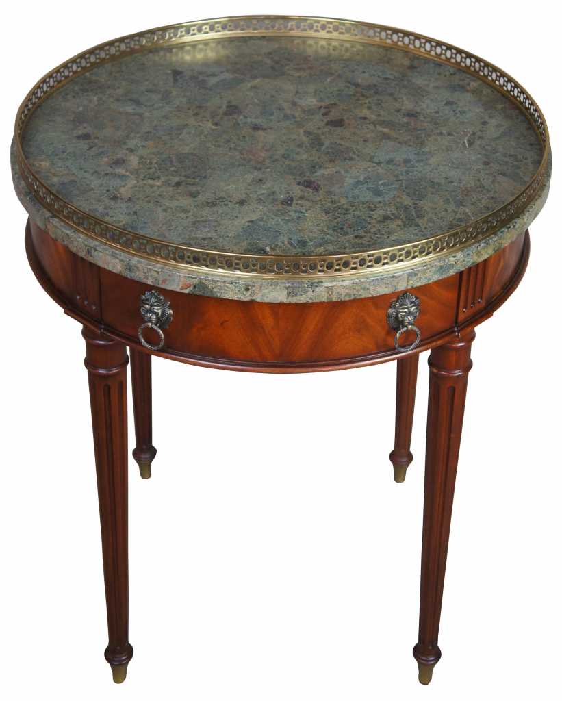 Maitland Smith Bouillotte table. Bouillotte was a card game similar to poker in the 18th century. The circular tessilated stone top features varying shades of green surrounded by a pierced brass gallery. Features a crotch mahogany base with two drawers and figural lion head pulls. Legs are fluted and tapered to an arrow foot with brass caps.