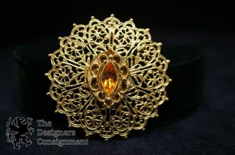 Brass Filigree Perfume Locket Brooch Pin Rhinestone Hidden Compartment Sunburst