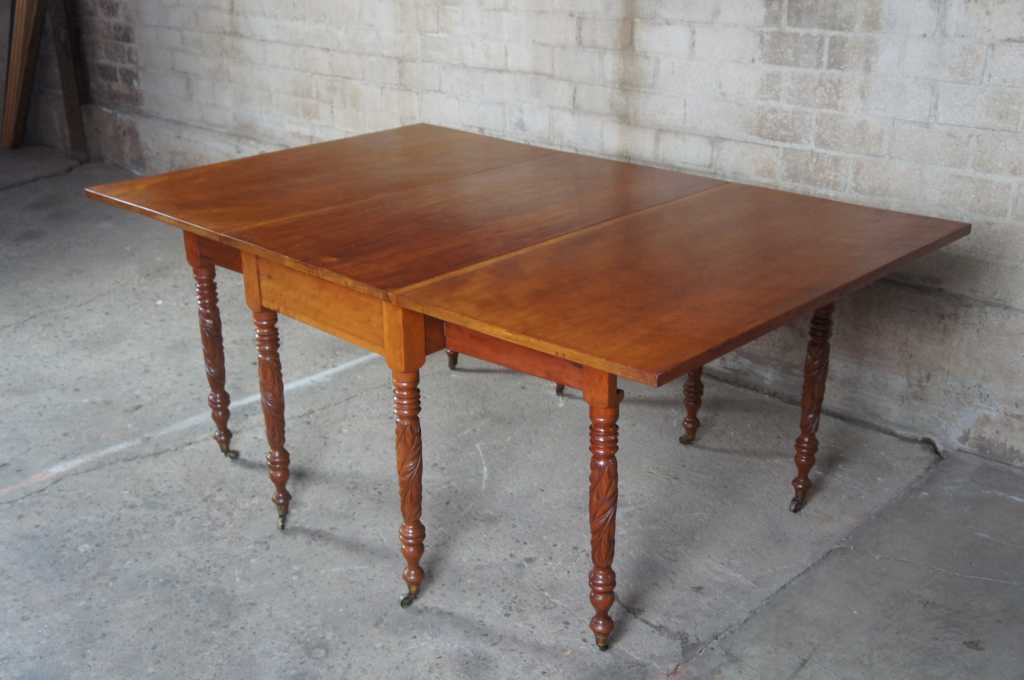 Antique American Empire cherry gateleg dropleaf dining table. Features ornate accents; turned legs with floral motif and brass caps and castors.
