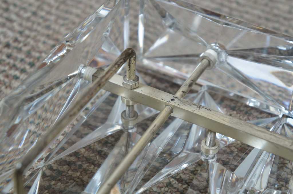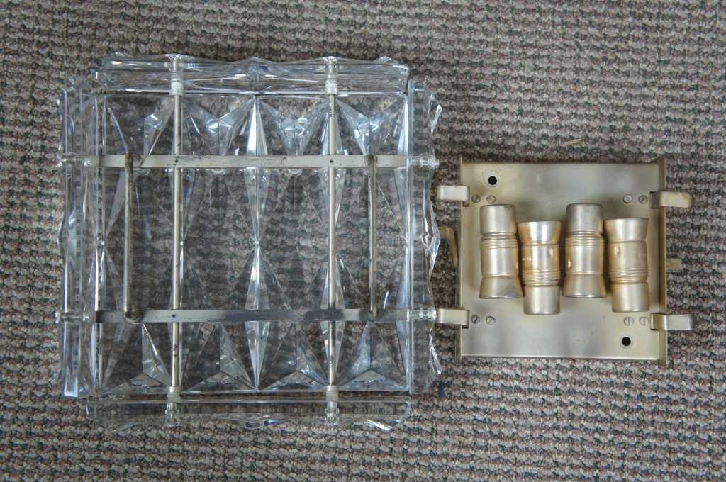 a neat vintage wall sconce with cut crystal design showing a geometric pattern. Socket holds 4 bulbs.