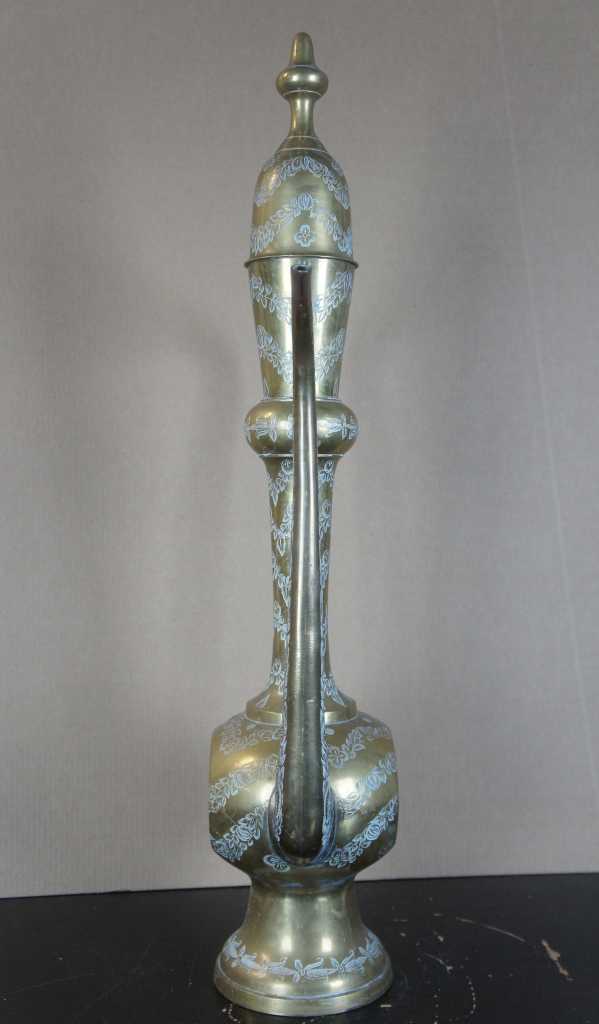 Oversized engraved brass pitcher. Perfect for serving use or as a vase or display piece.