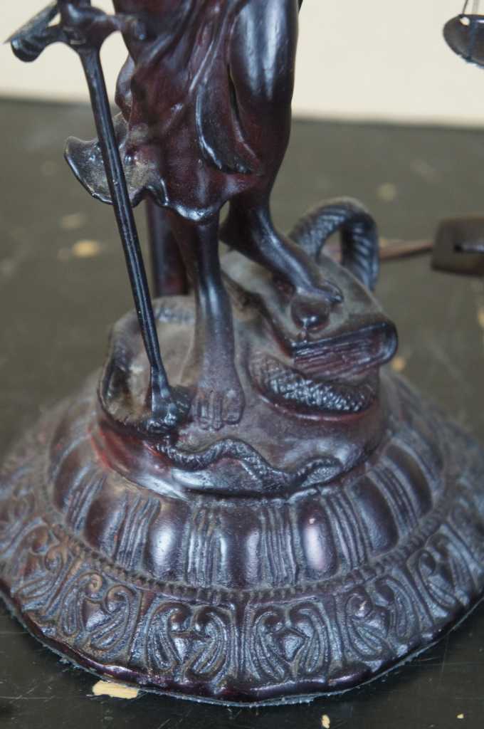 Art Nouveau style lady justice lamp. Features a colorful glass shade. This lamp is a reproduction