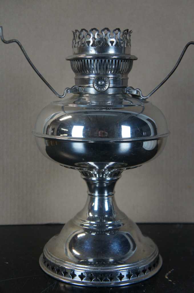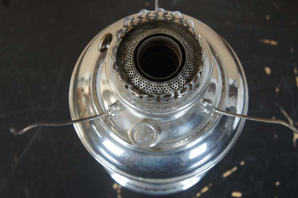 Rayo brass hurricane lantern, pat. 1905. Includes long glass chimney and etched floral ruffled glass shade.