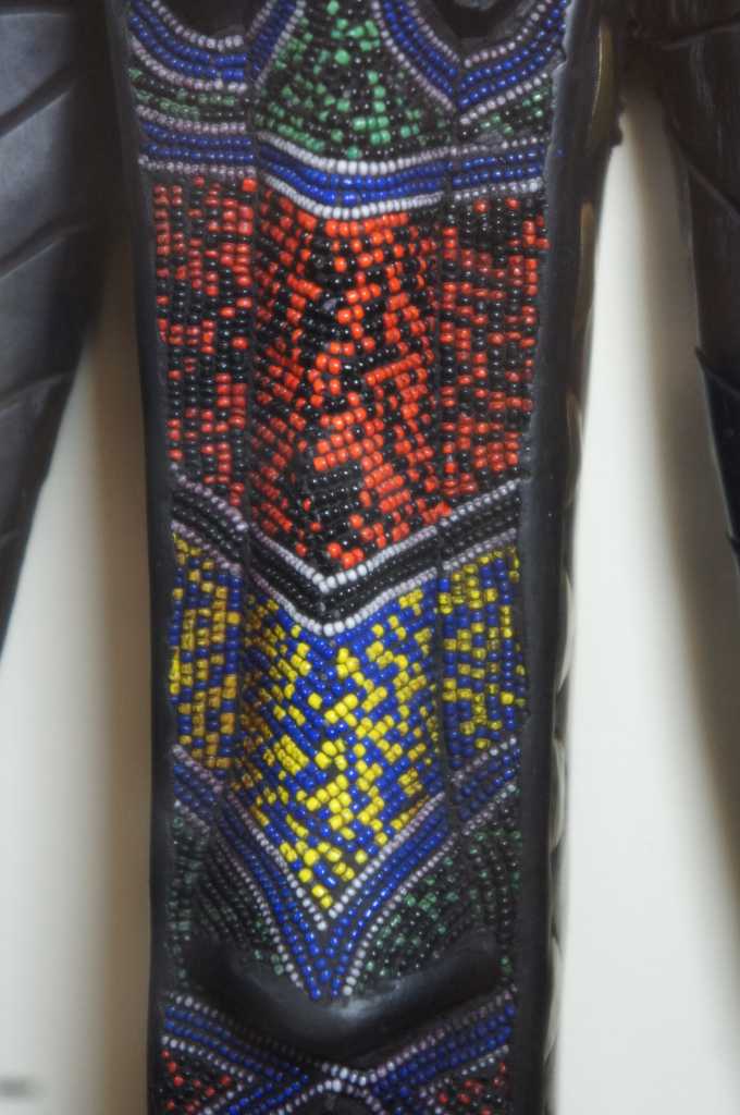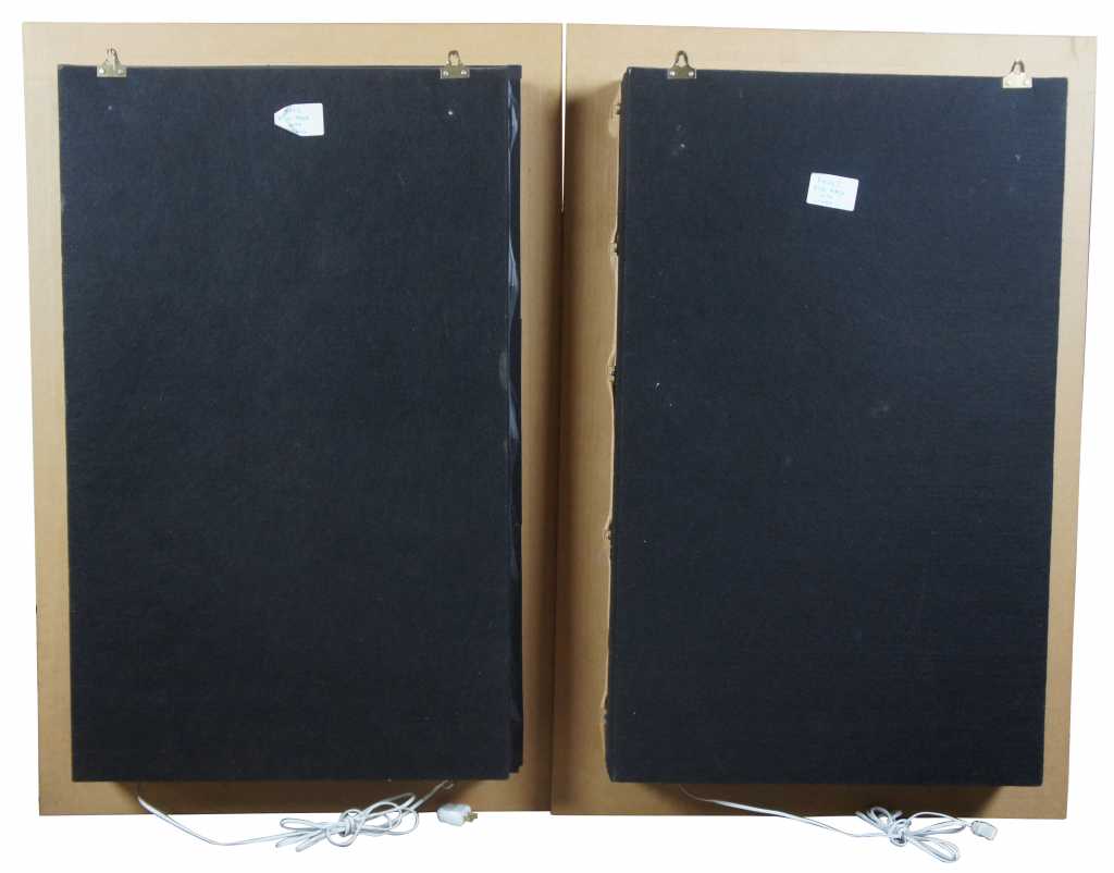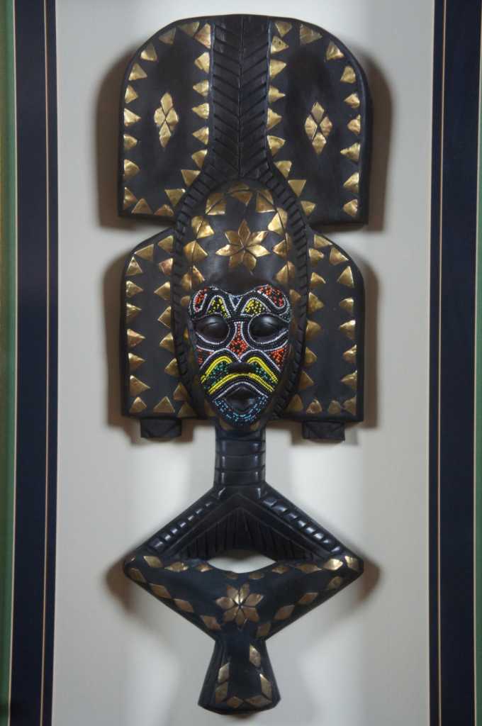 A unique pair of African carved masks with beaded and painted accents. Each is mounted behind glass in an illuminated frame with gold painted edges.