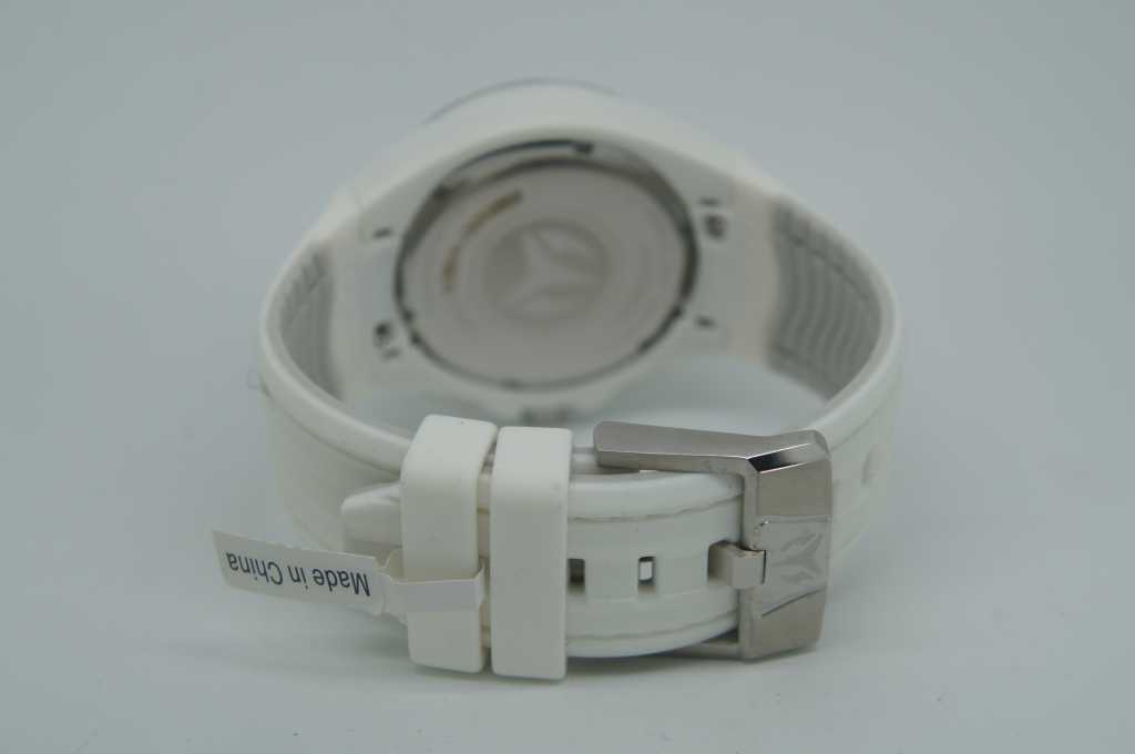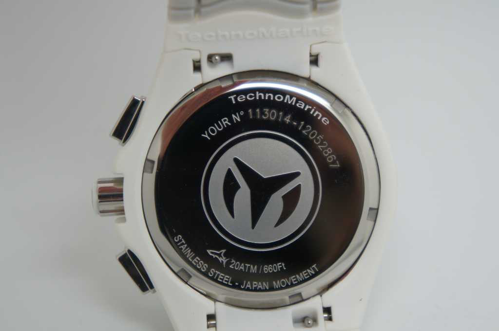 Stainless steel case with white rubber covering with a white rubber strap. Uni-directional rotating bezel. White dial with silver-tone hands and index and Arabic numeral hour markers. Minute markers around the outer rim. Dial Type: Analog. Luminescent hands. Date display between 4 and 5 o'clock position. Chronograph - three sub-dials displaying: 60 second, 60 minute and 24 hour. Quartz movement. Scratch resistant Mineral crystal. Screw down and Push Button crown. Solid case back. Case diameter: 45 mm. Case thickness: 14 mm. Round case shape. Band width: 17 mm. Tang clasp. Water resistant at 200 meters / 660 feet. Functions: date, hour, minute, second, chronograph. Sport watch style. Watch label: Japan Movt. Technomarine Cruise Vision II White Dial White Rubber Unisex Watch 113014.