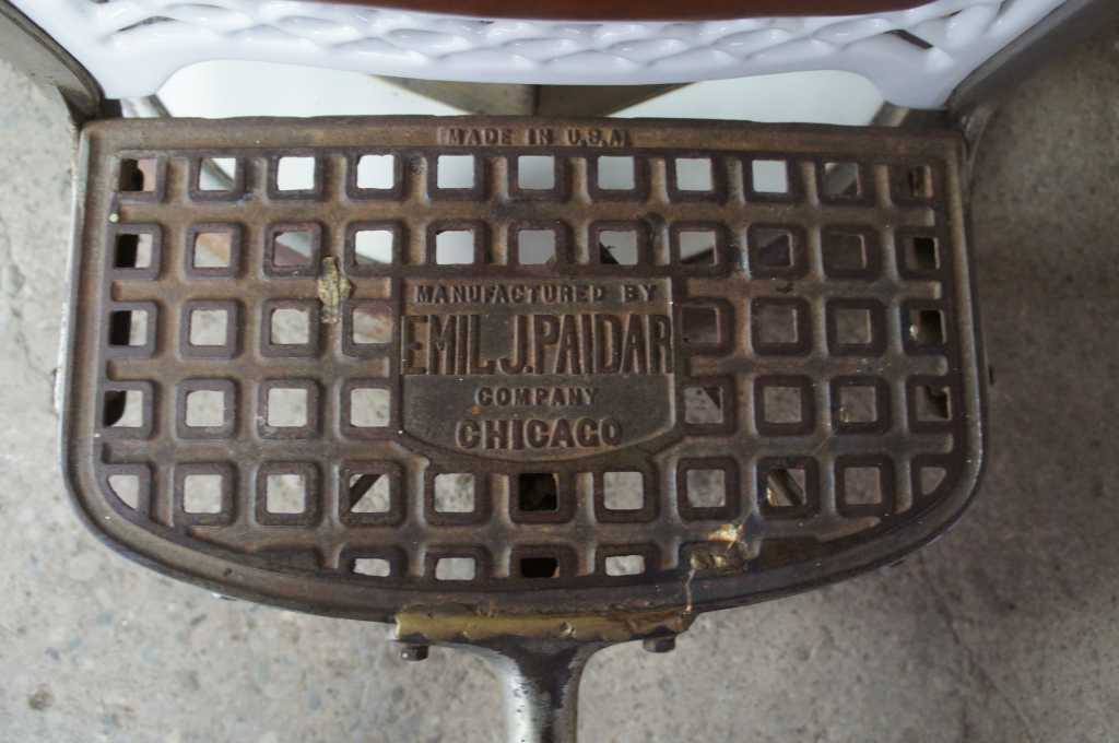 Emil J. Paider barbers chair. White enameled cast iron with brown leather. Features ornate details, adjustable headrest, fully functional hydraulics.