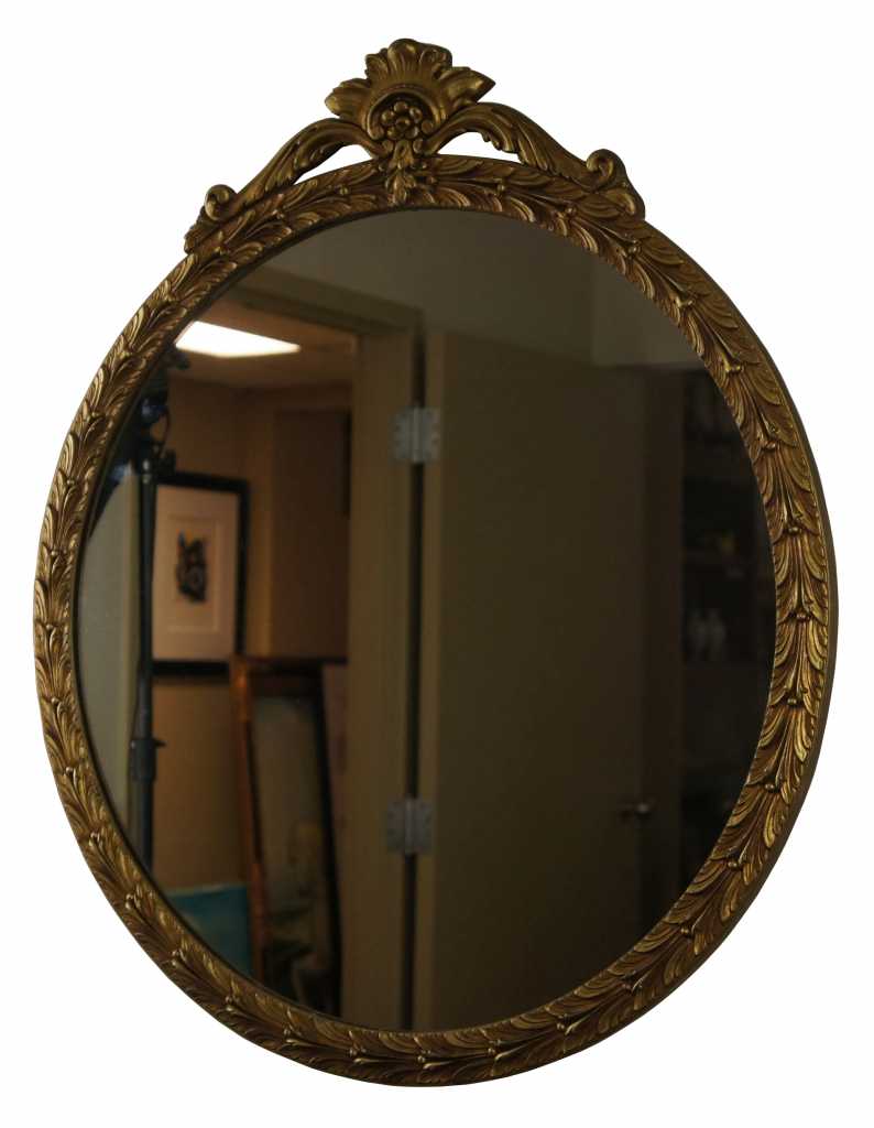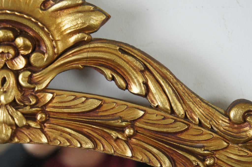 Mid 20th century French wall mirror. Features gold frame with acanthus design and floral crest topper.