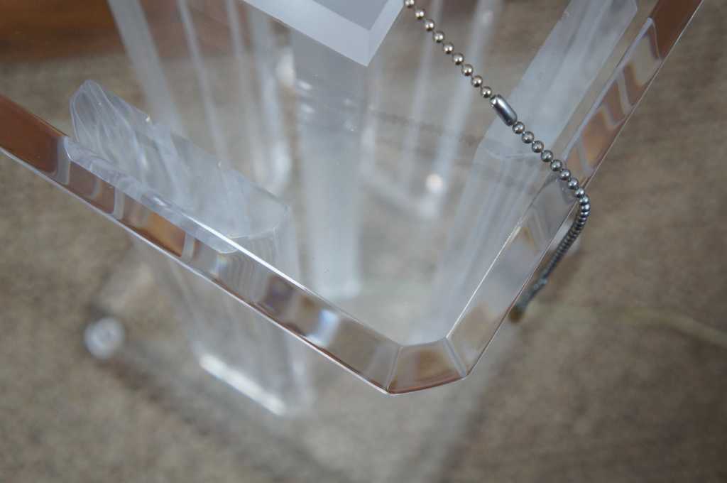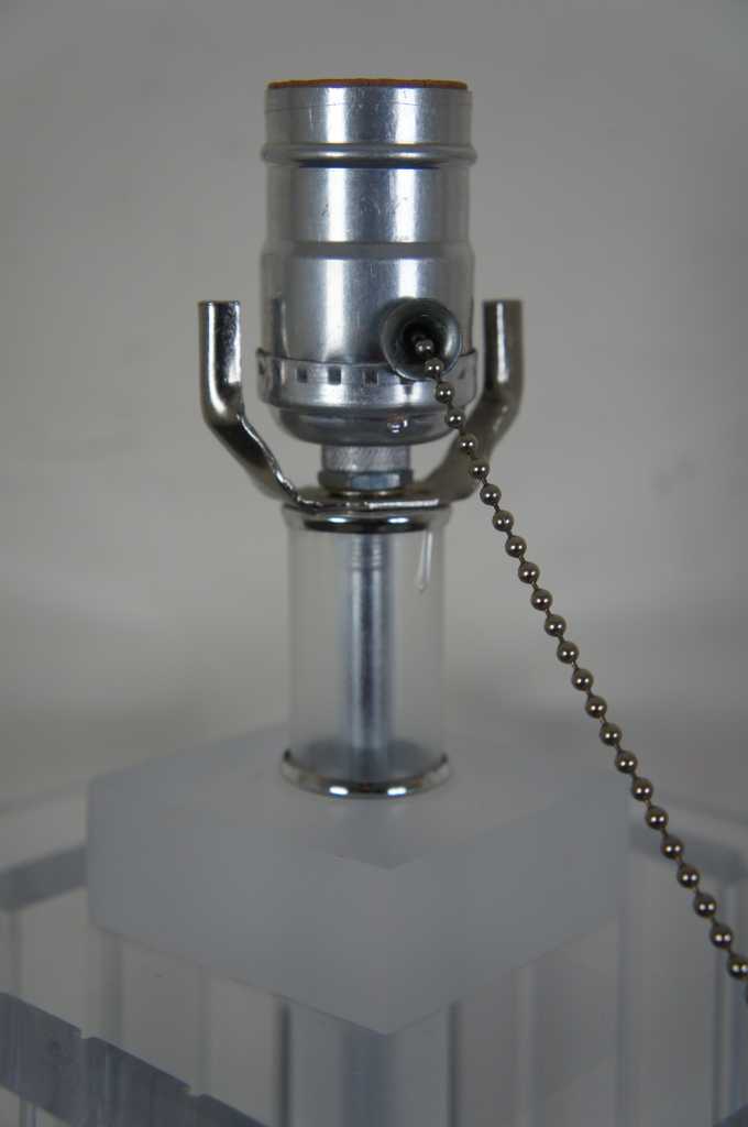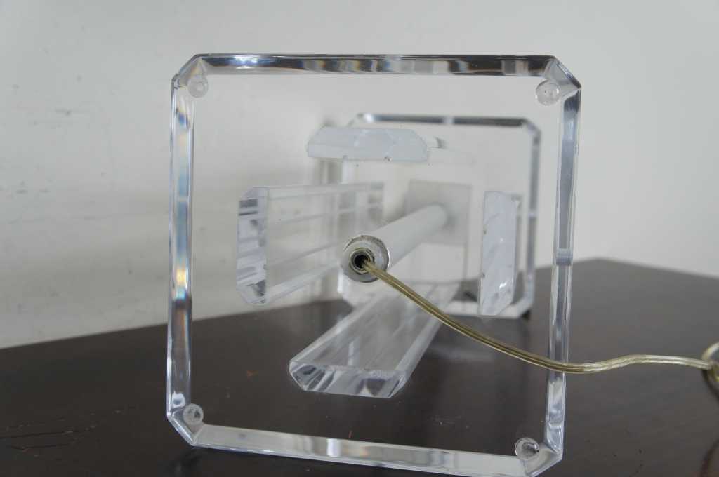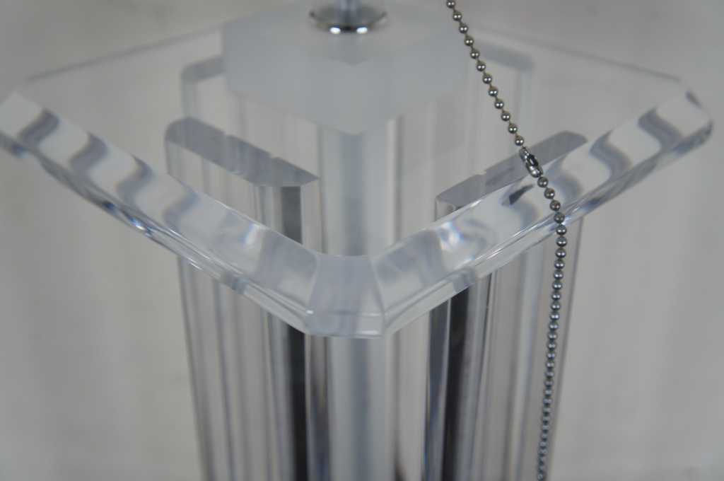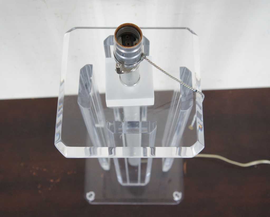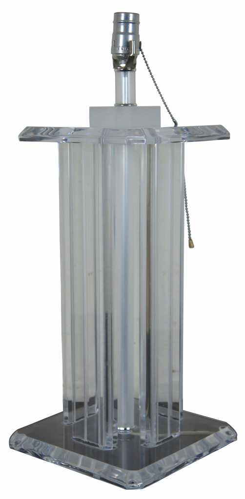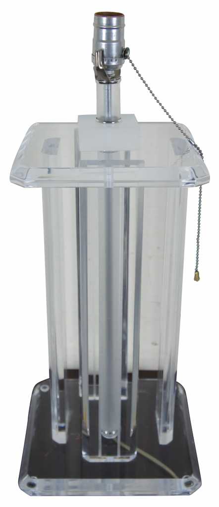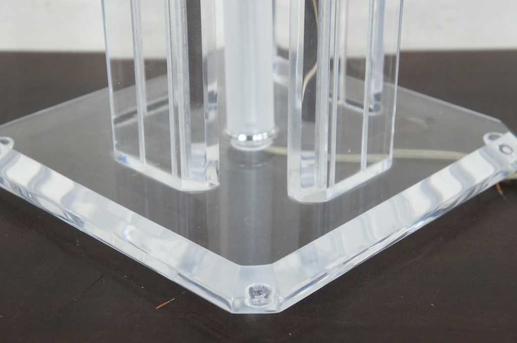Lucite table lamp featuring four columns between square surfaces with beveled edges.