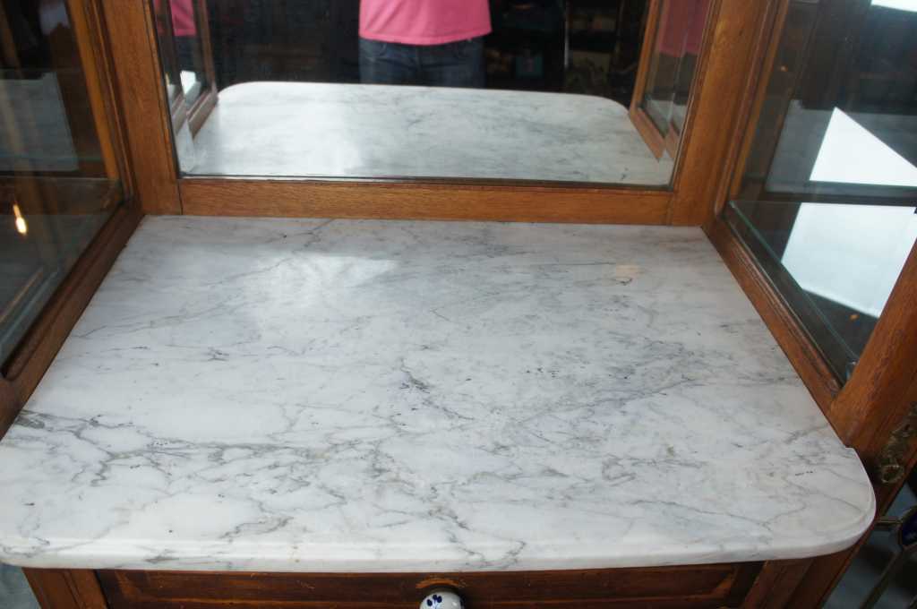 Good antique condition, distressing from use, marking from age, upper drawer does not have inlay along front, outer legs missing front edge of turning, some scratching to marble surface.