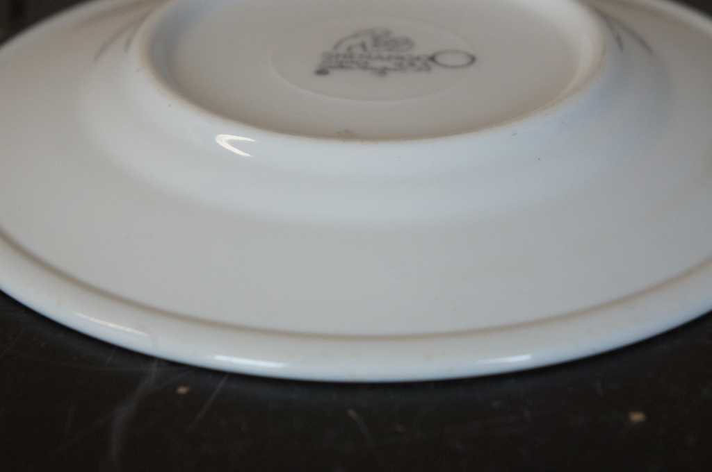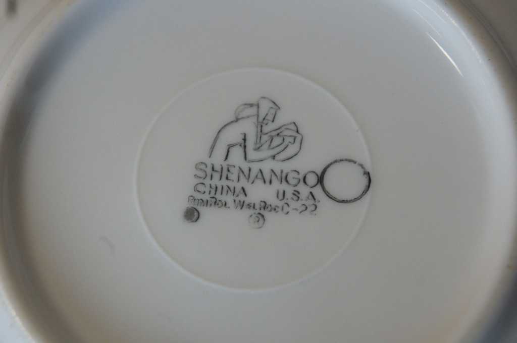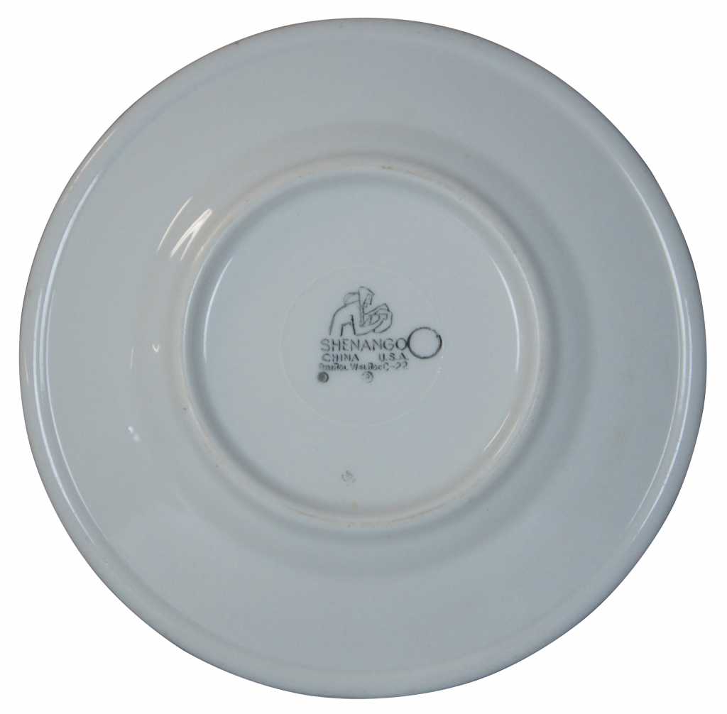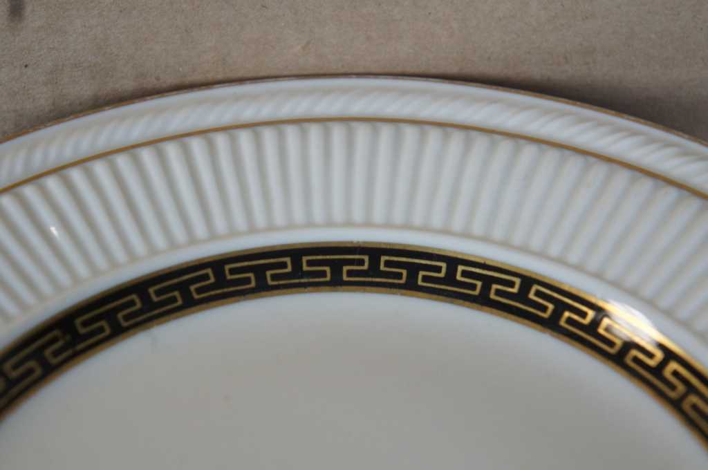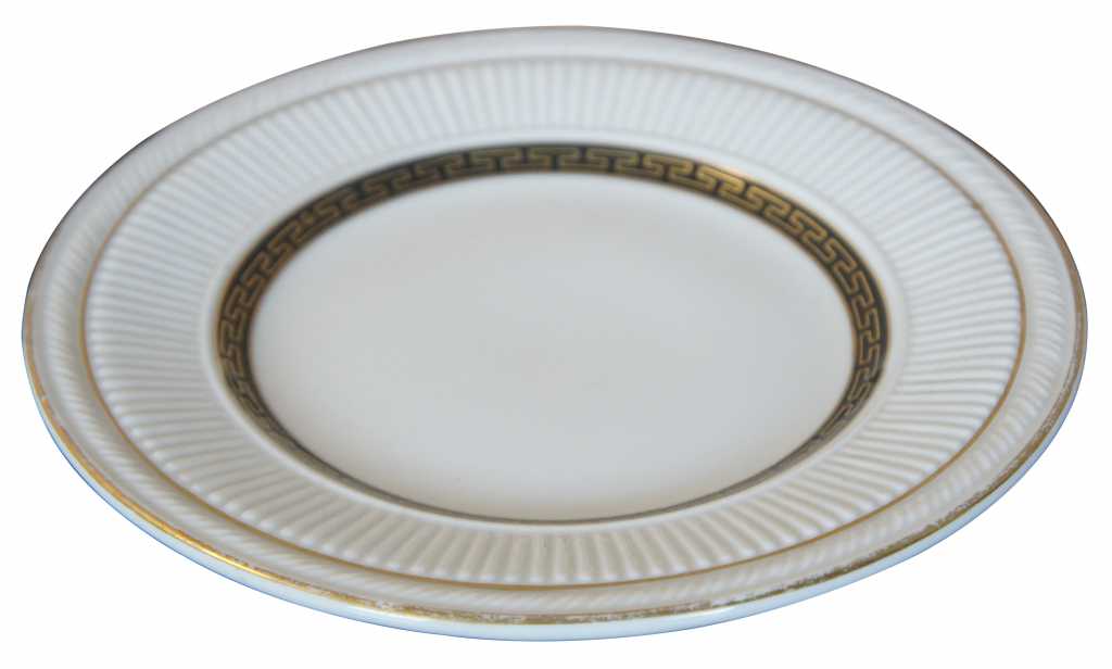 Shenango Dinnerware Bread & Butter Plate. Quantity 181, sold separately. Greek Key design. Ivory color with black and gold trim. This set came from the Oakwood Club, a fine dining restaurant in Dayton, Ohio. They opened in 1962, and this was their original set before going into storage.