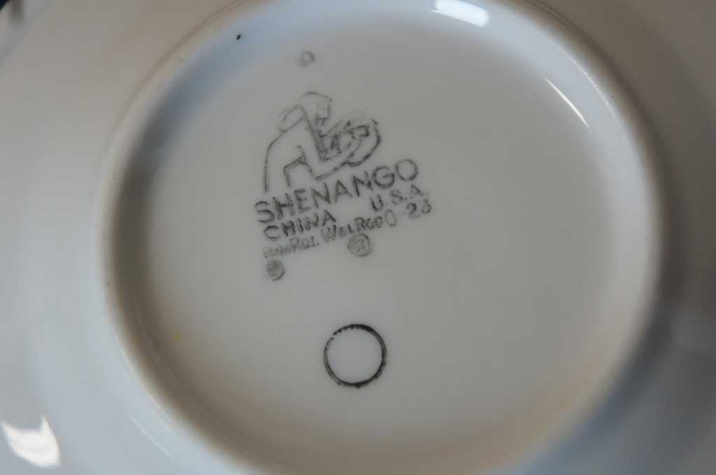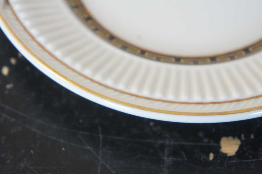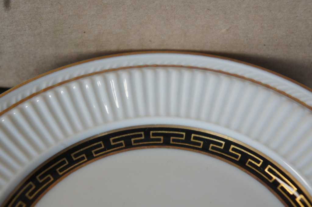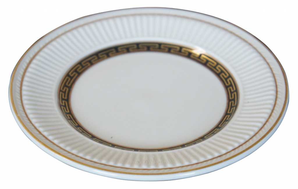 Shenango Dinnerware Dessert Plate. Quantity 43, sold separately. Greek Key design. Ivory color with black and gold trim. This set came from the Oakwood Club, a fine dining restaurant in Dayton, Ohio. They opened in 1962, and this was their original set before going into storage.