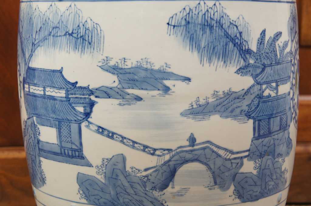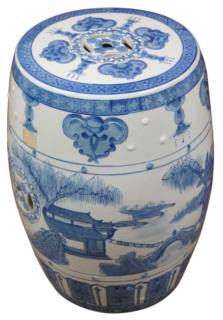 Chinese ceramic garden stool, features pagoda scene and pierced designs. Great as a side or end table, stool or plant stand.