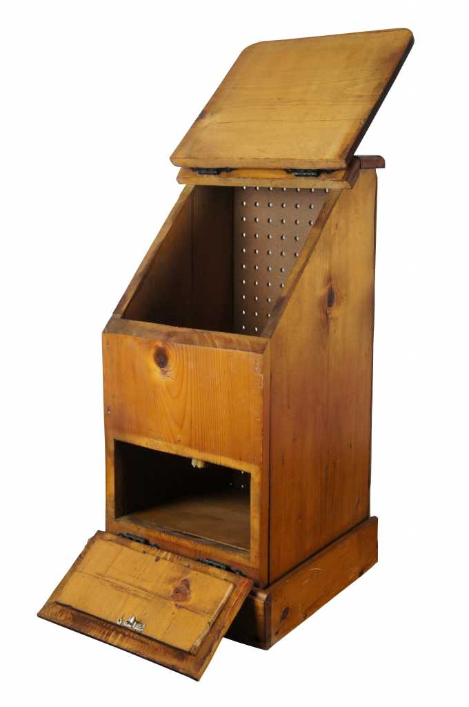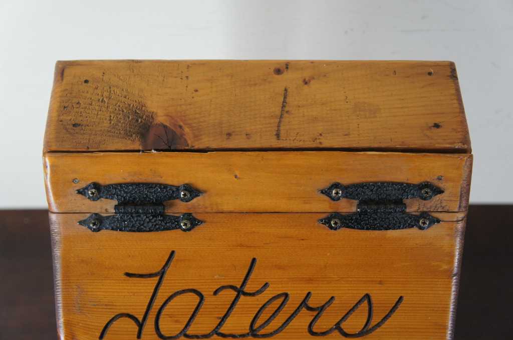 Taters & Onyins farmhouse storage bin. Made from pine with rustic design. Features a stant front with lid and lower latch drawer.