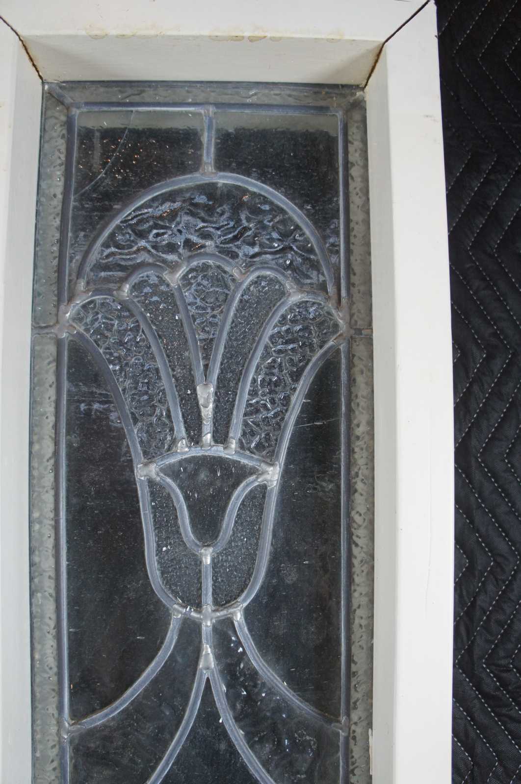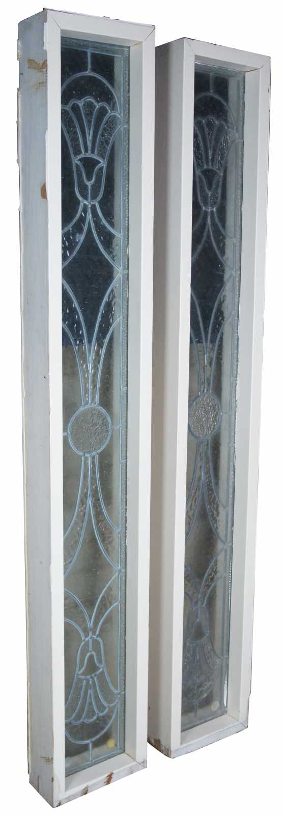 Two large full length sidelight (door flanking) antique victorian leaded stained glass window panels. Made to flank a doorway / entryway. Features a wood shadow box style frame with a protective glass in front of the stained glass.
