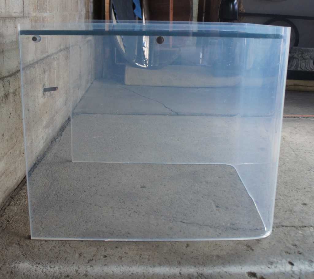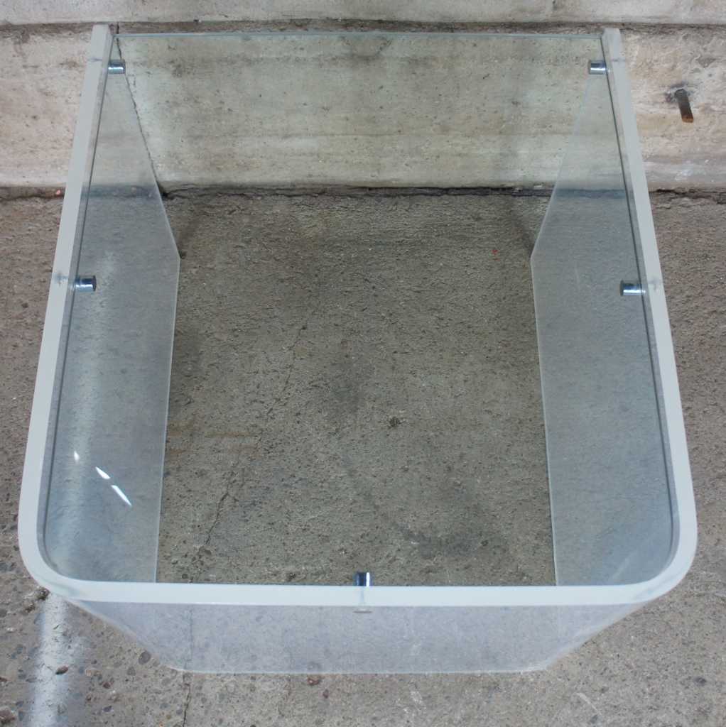 Mid century U formed acrylic or lucite side table with glass top. Glass top is supported by five chrome pins. Glass features a polished edge.