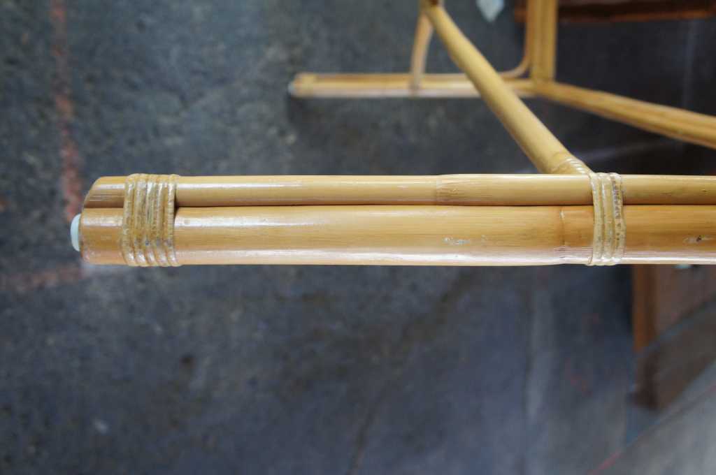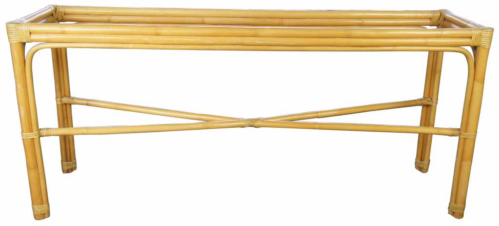 Circa 1970s bamboo and rattan console or hall table. Features a rectangular form with x shaped stretcher. Reminiscent of Mcguire and Ficks Reed craftsmanship.